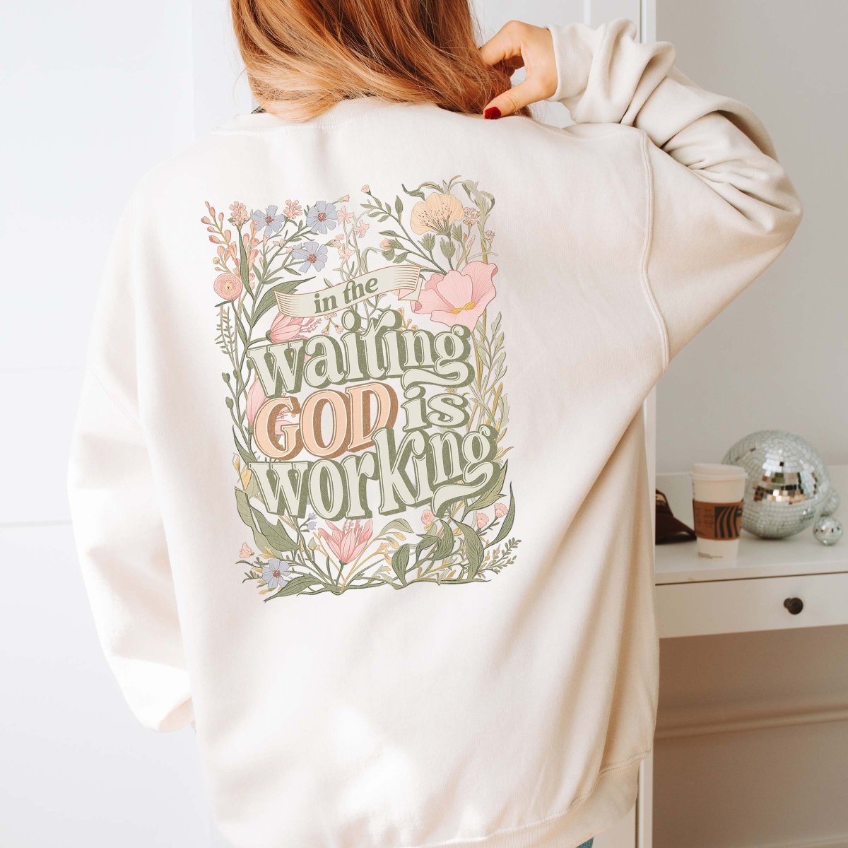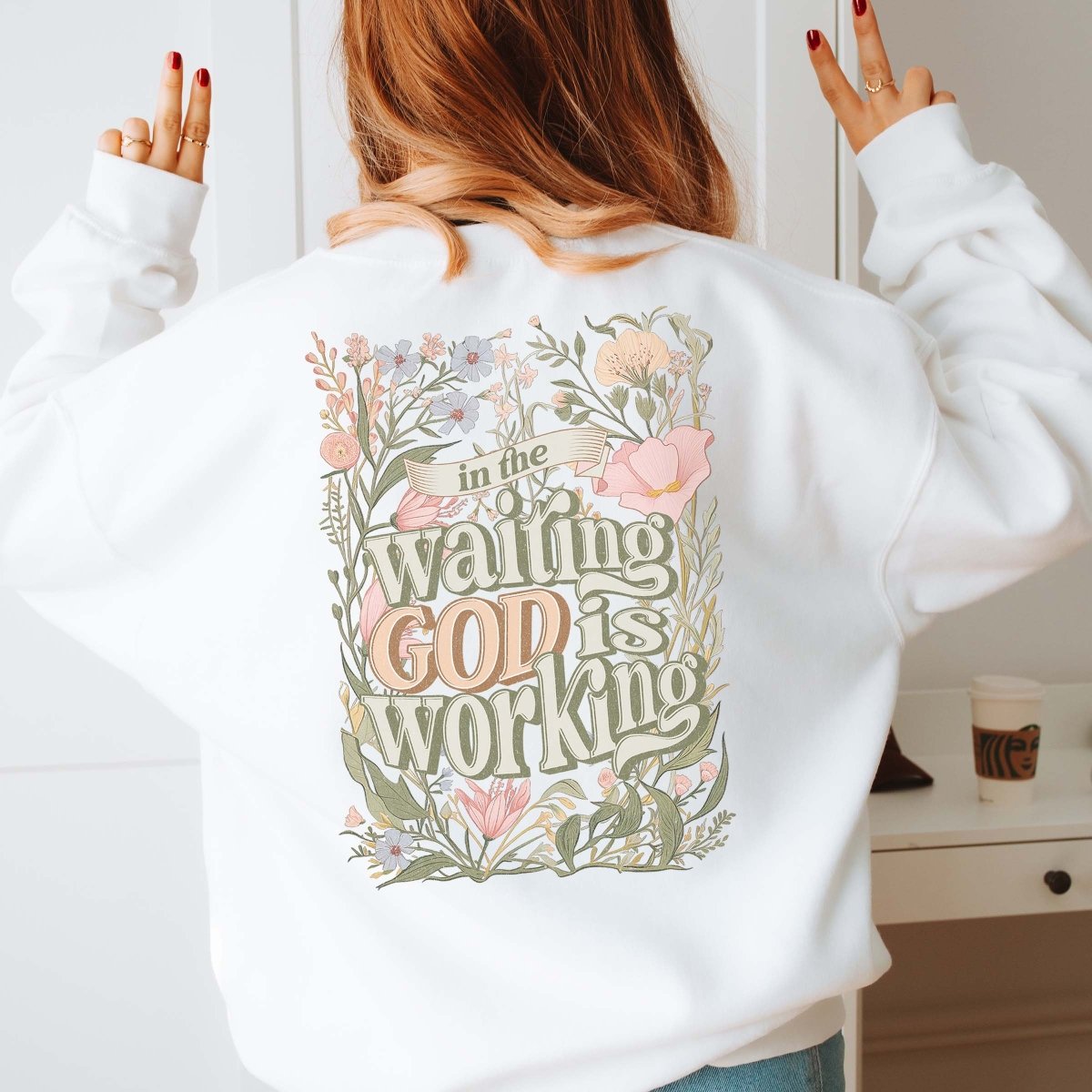 Feel the comfort and inspiration of this ultra-soft graphic sweatshirt, adorned with a striking message on the back: "In The Waiting, God Is Working." This is the perfect piece for layering on those cooler days, effortlessly blending faith with fashion. Whether you're dressing up for Sunday mornings, running errands, or simply relaxing at home, this sweatshirt is a meaningful wardrobe staple.