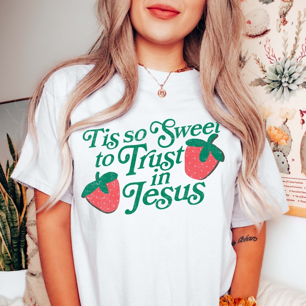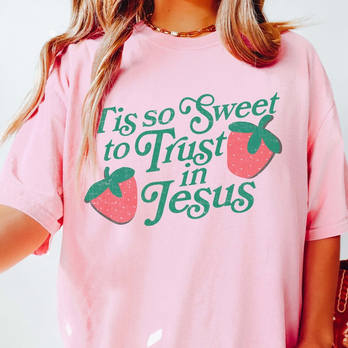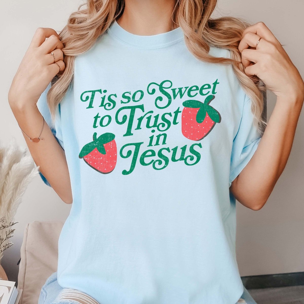 Looking for a gentle reminder of your faith throughout the day? Meet your new favorite tee, the "Tis So Sweet To Trust In Jesus" Comfort Color Tee, adorned with charming strawberries.