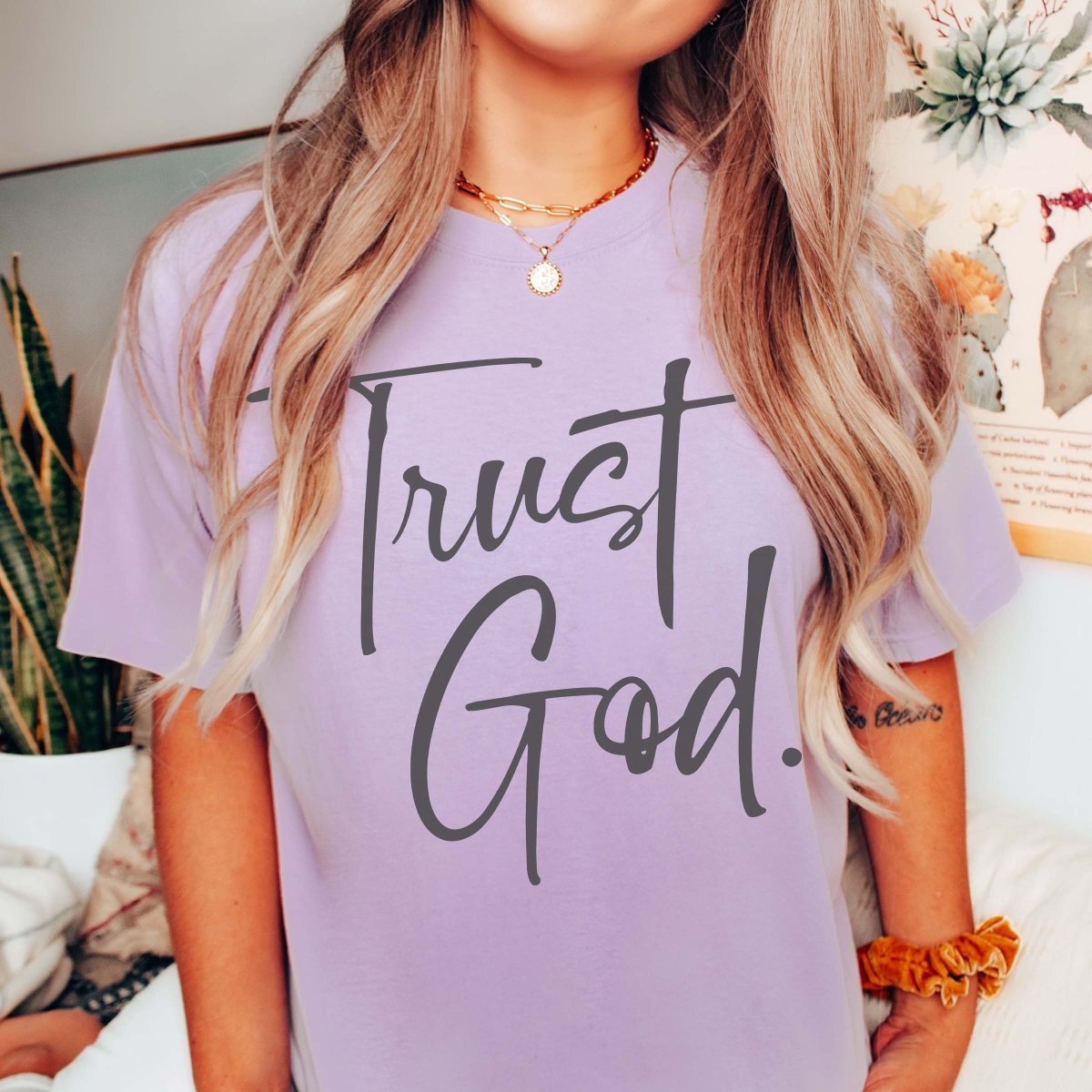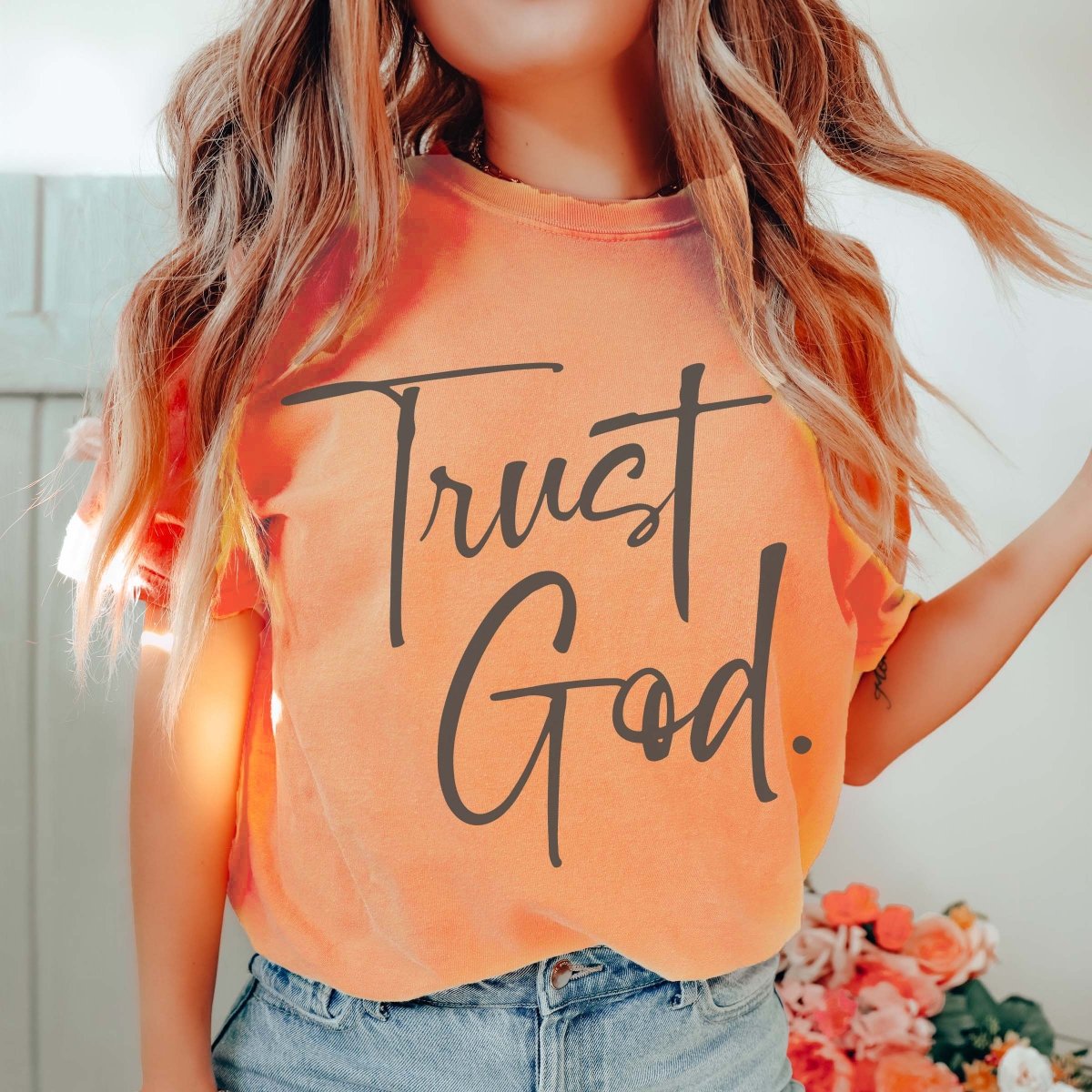 Find strength and comfort in our "Trust God" Comfort Color Graphic Tee. This tee features a bold, uplifting message on the back, reminding you to lean on faith through every season. Crafted from soft-washed, premium cotton, it offers unmatched comfort, breathability, and durability for your everyday adventures. With vibrant direct-to-garment printing, the design stays sharp and enduring, wash after wash. Whether you're running errands or relaxing with loved ones, this tee combines faith and style, making it a perfect addition to your wardrobe.