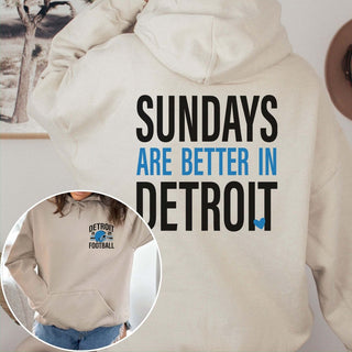 Embrace the spirit of Detroit football with the "Sundays Are Better in Detroit" Graphic Hoodie! This hoodie is perfect for fans who want to make a bold statement and stay cozy, thanks to its classic front pocket design and striking graphic on the back.
