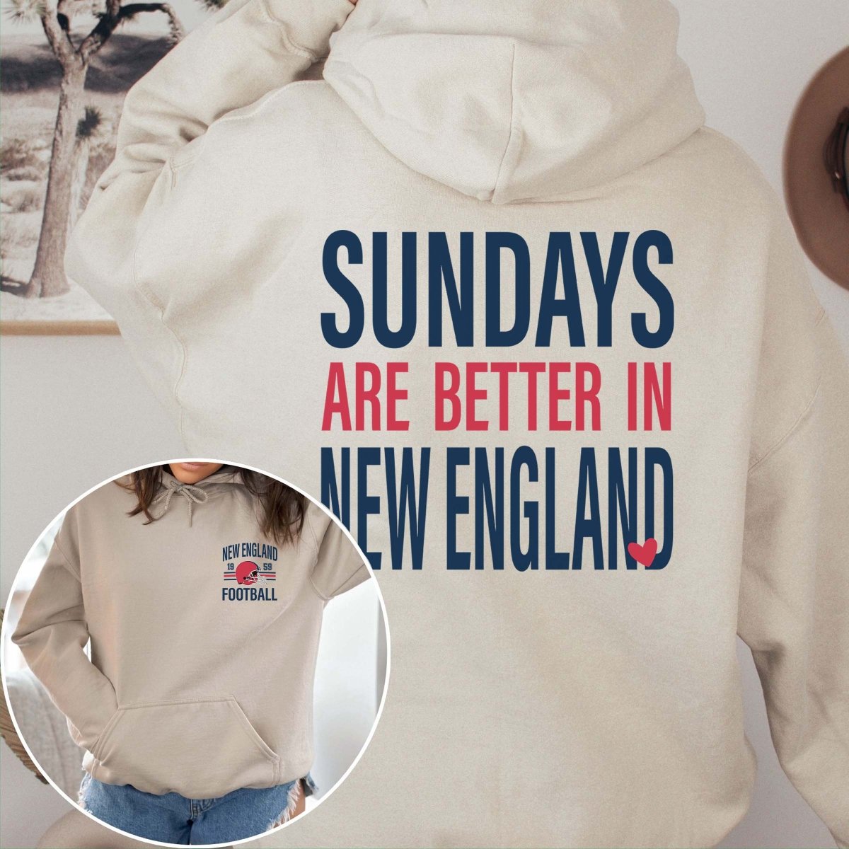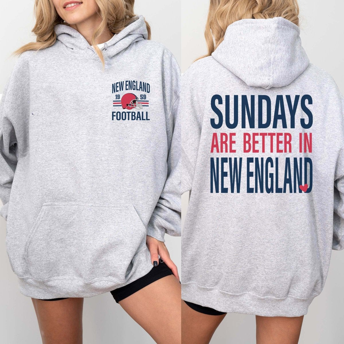 Showcase your passion for New England football with our Sundays Are Better In New England Graphic Hoodie! This hoodie combines a cozy front pocket design with a striking message on the back, making it the ultimate choice for true fans.