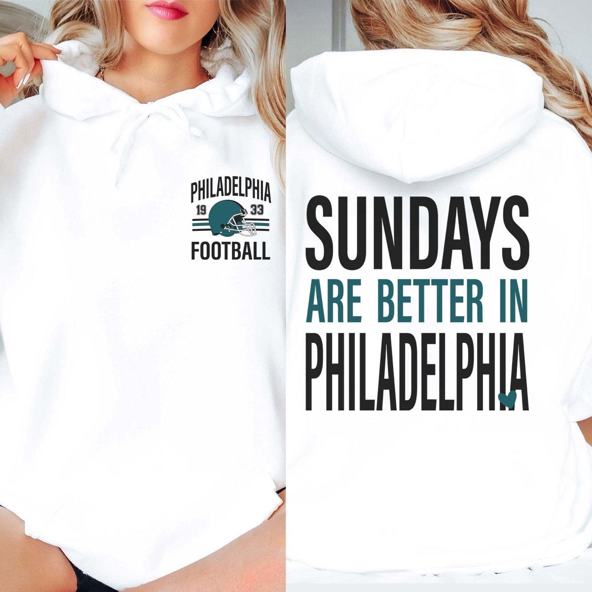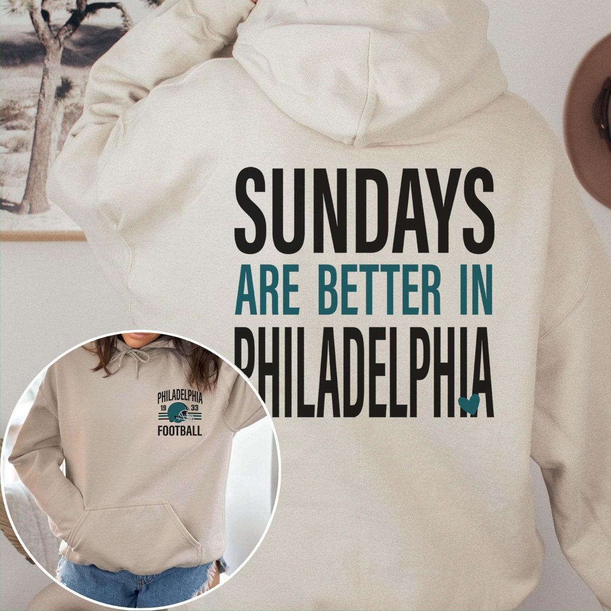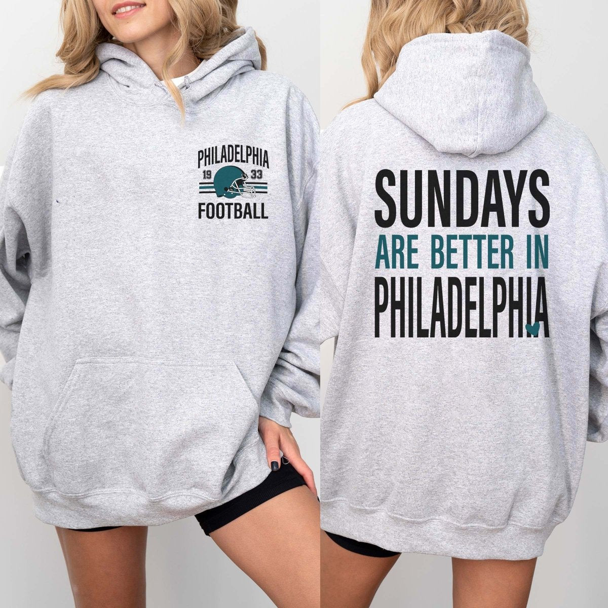 Wrap yourself in comfort and Philadelphia pride with the "Sundays Are Better In Philadelphia Graphic Hoodie"! This cozy piece is perfect for all football enthusiasts who love to cheer on their favorite team. With its handy front pocket and eye-catching graphic on the back, it's designed to keep you stylish and snug, whether you're tailgating, at the stadium, or relaxing at home.