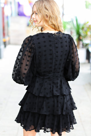Holiday Vixen Black Chiffon Swiss Dot V Neck Tiered Ruffle Dress