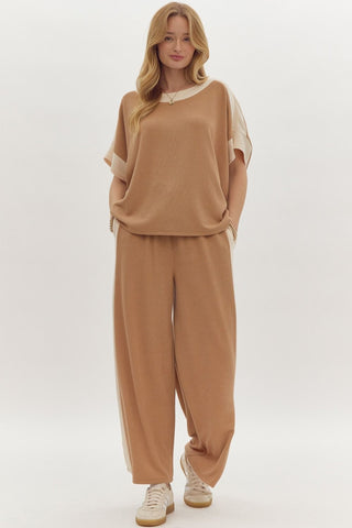 Solid Ribbed Contrast Trim Wide Leg Pants in Camel