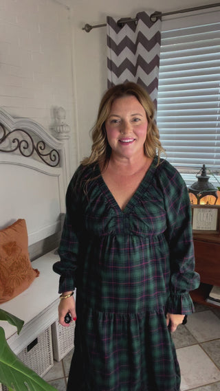 All I Want Hunter Green Plaid Elastic V Neck Tiered Maxi Dress