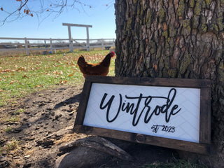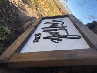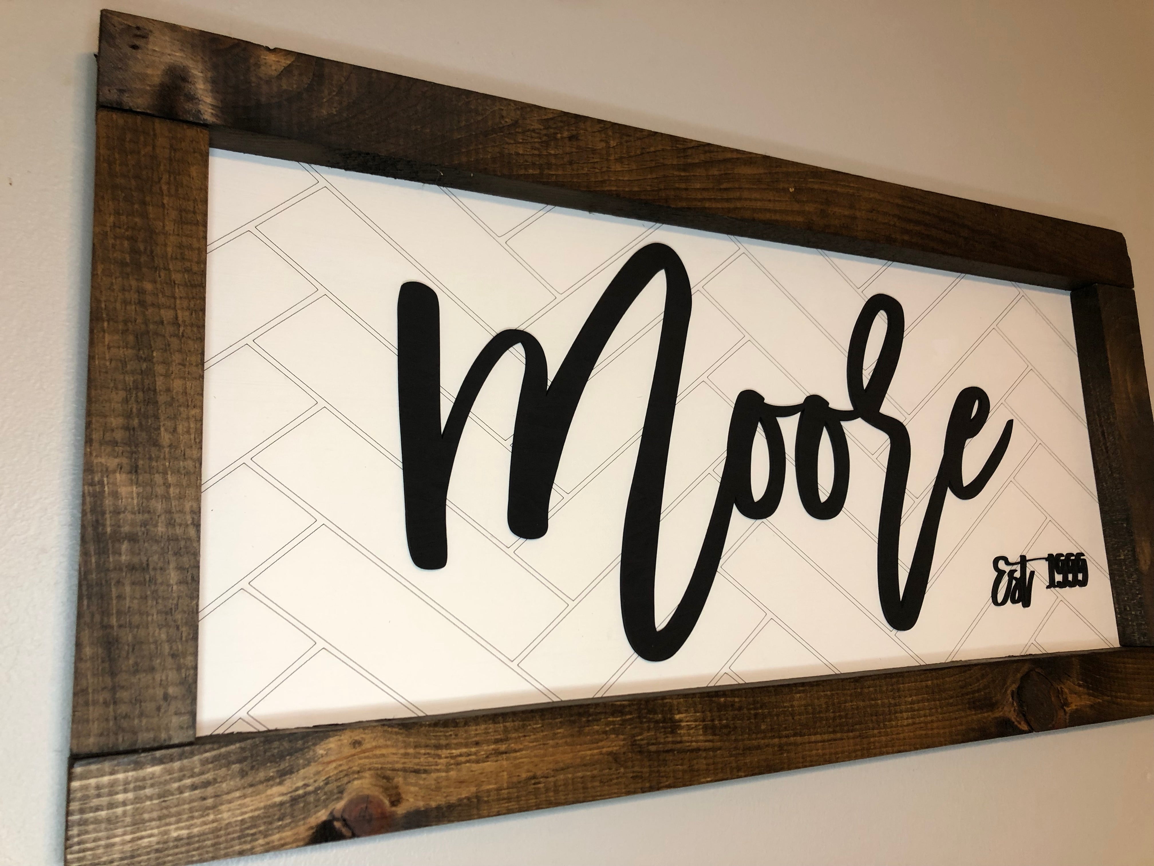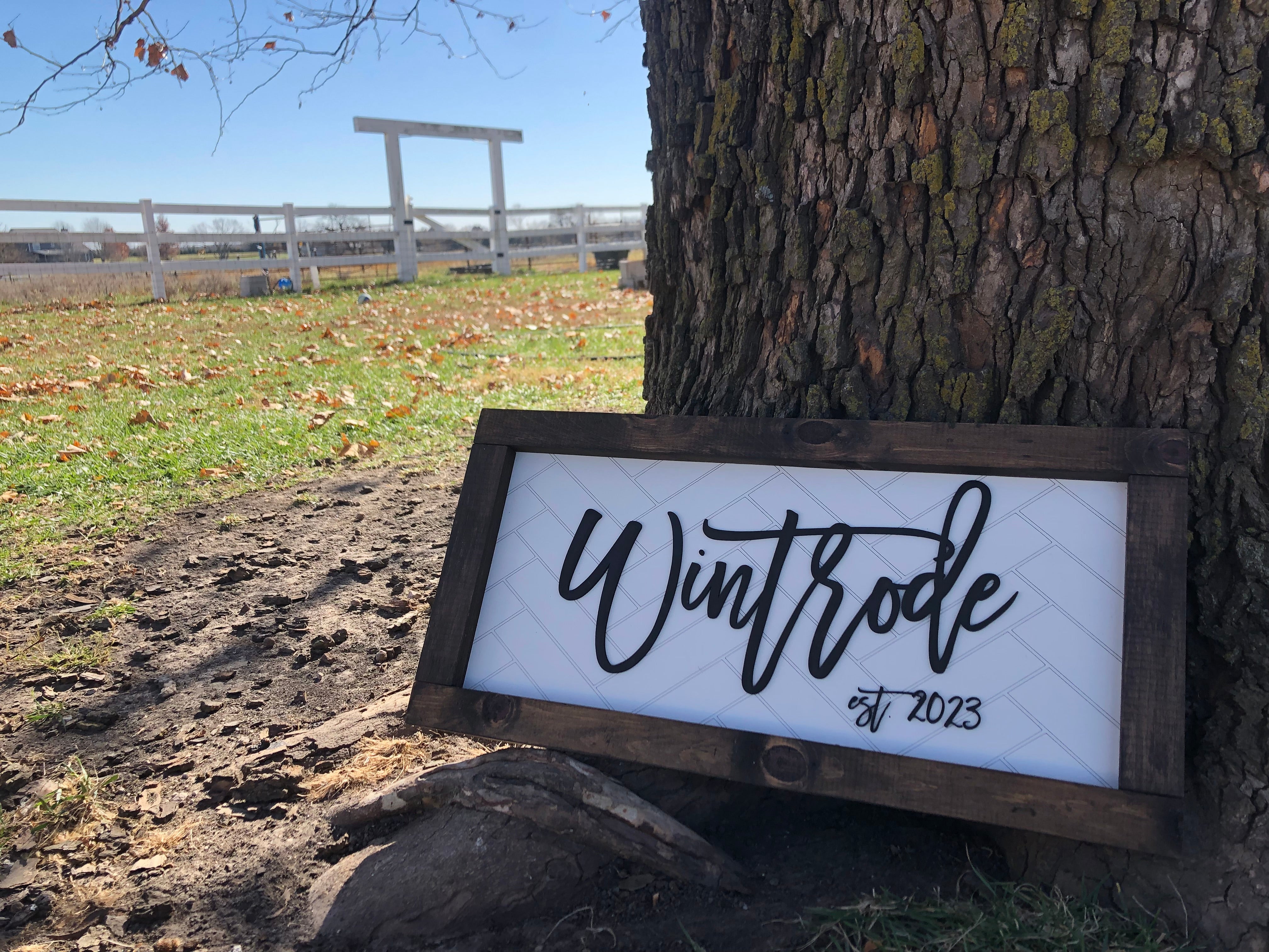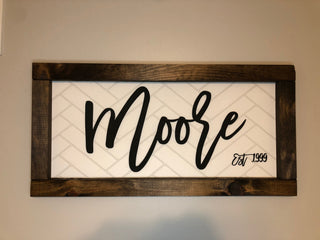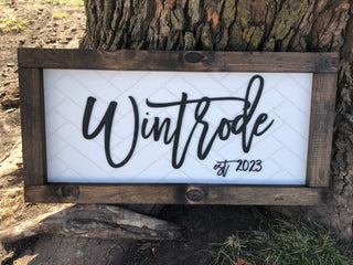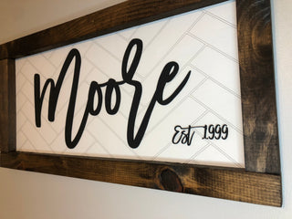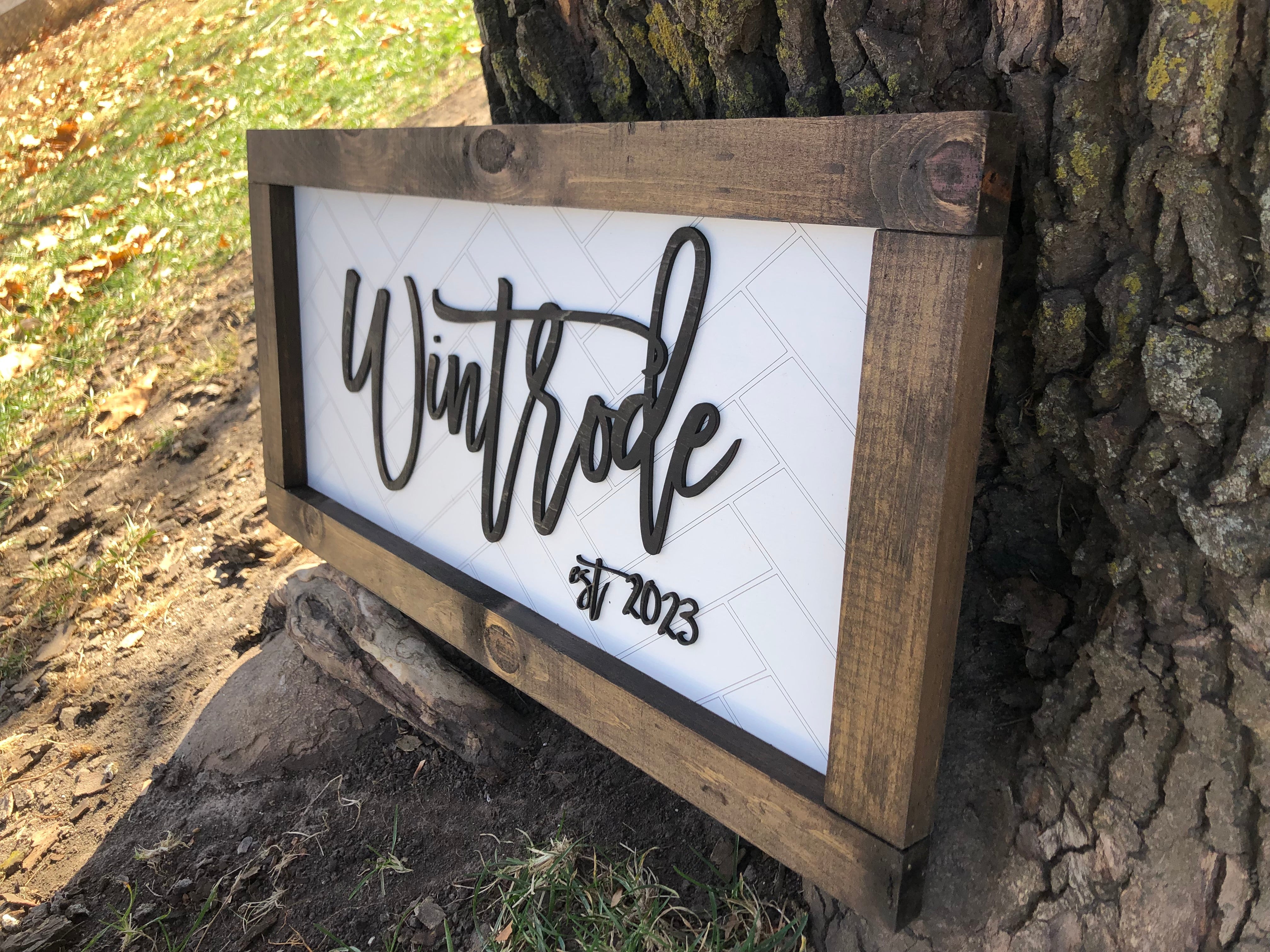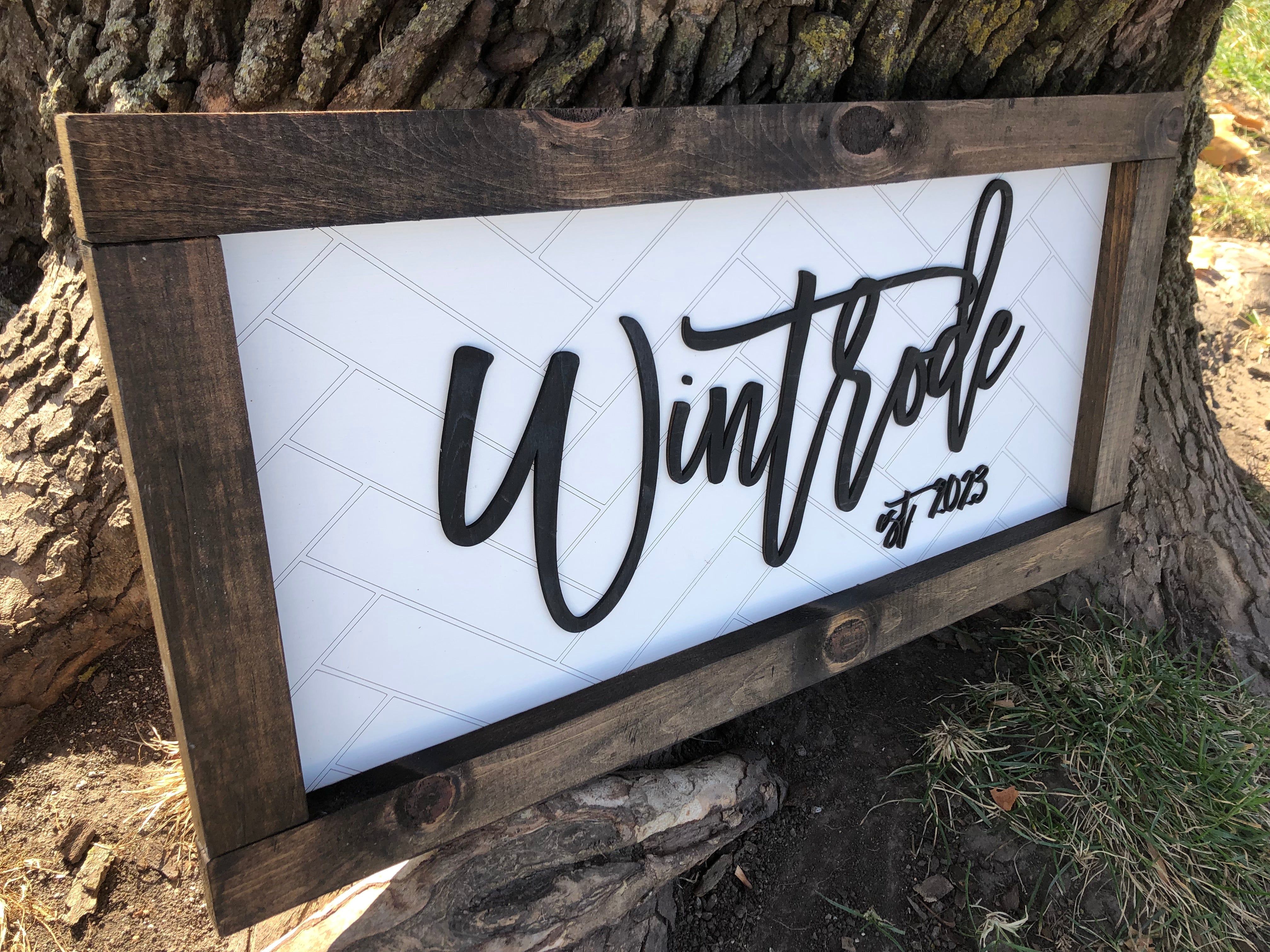 This name sign is a combination of engraving with the herringbone background and 3D with your last name and year being laser cut. The size is 24"x12"