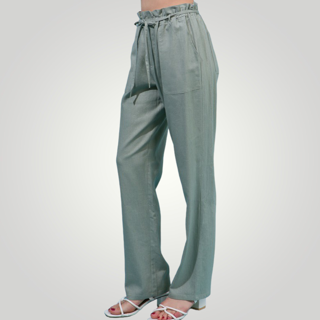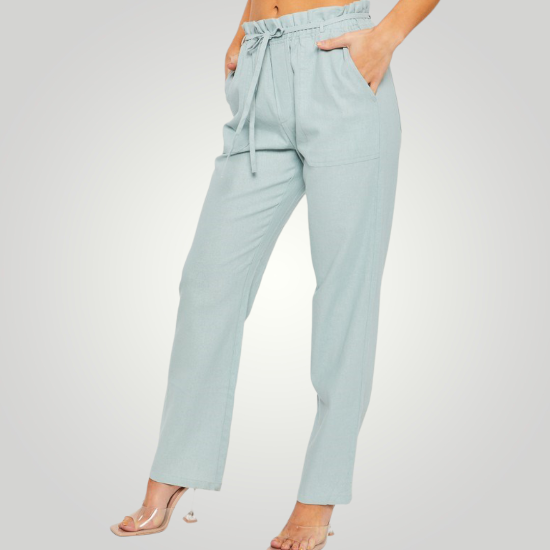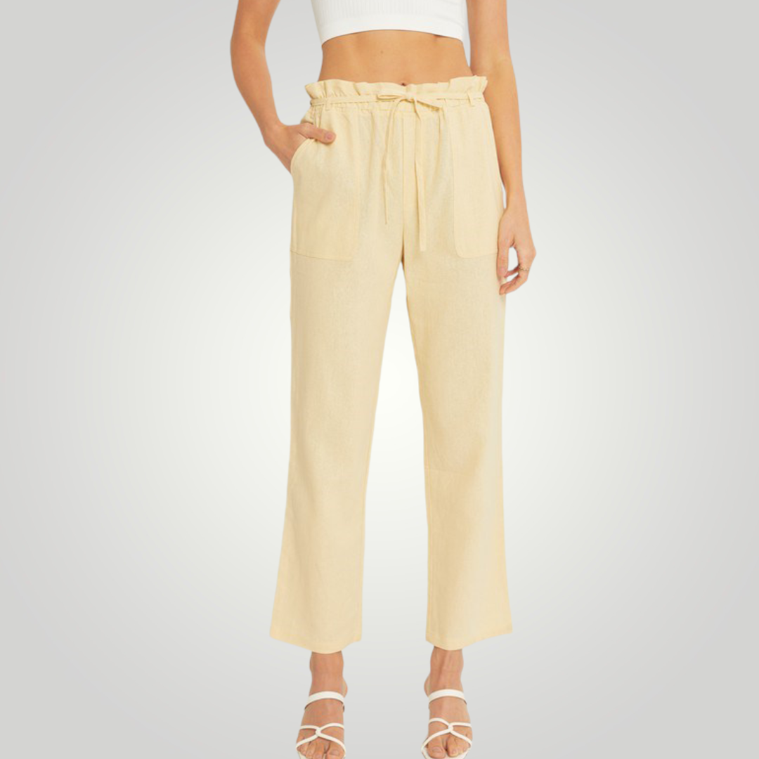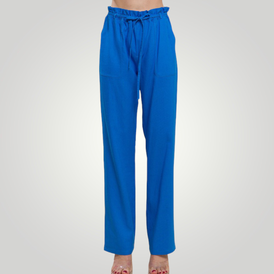 The high waist on our paperbag linen blend high rise is ultra-flattering! These beauties are crafted with a high waist and a wide pant legs. The elastic waist, side pockets, and drawstring ties add detail.