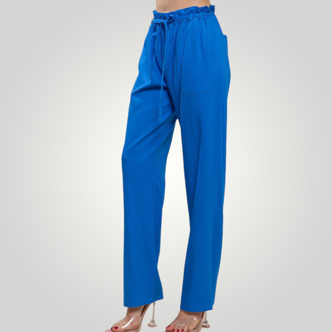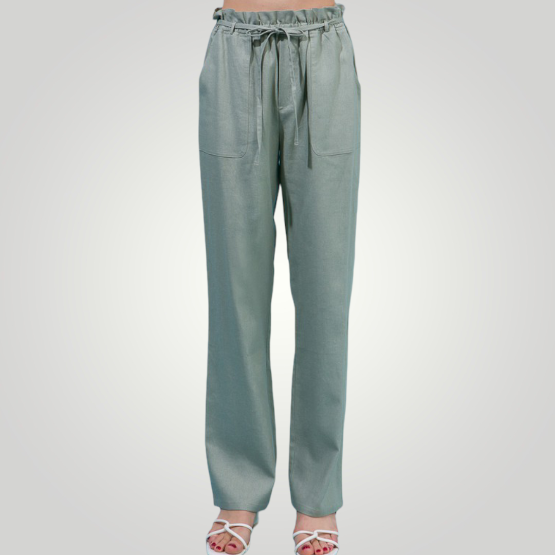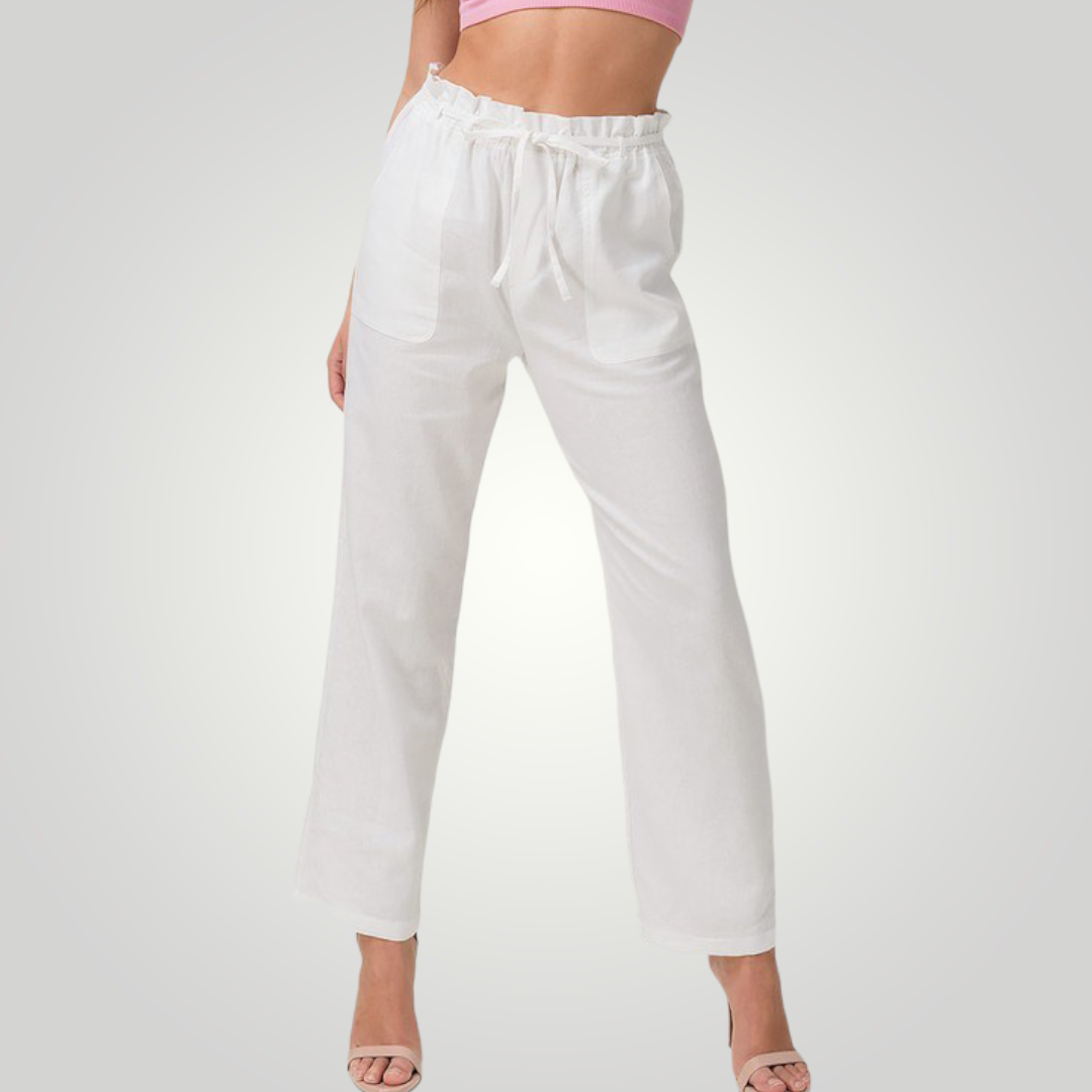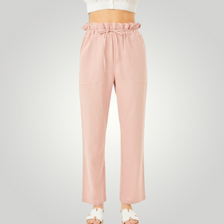 The high waist on our paperbag linen blend high rise is ultra-flattering! These beauties are crafted with a high waist and a wide pant legs. The elastic waist, side pockets, and drawstring ties add detail.