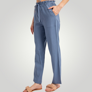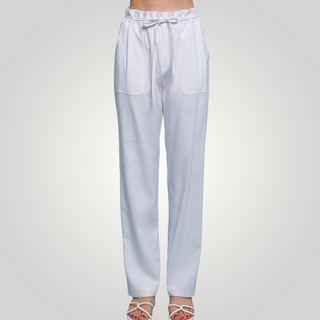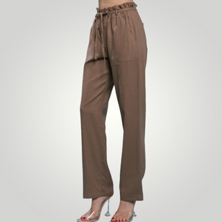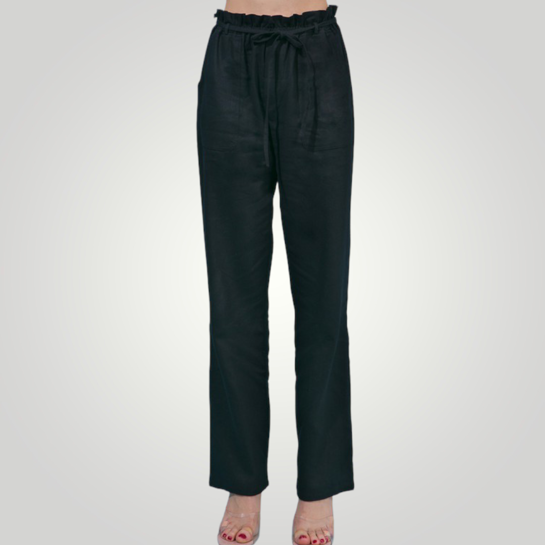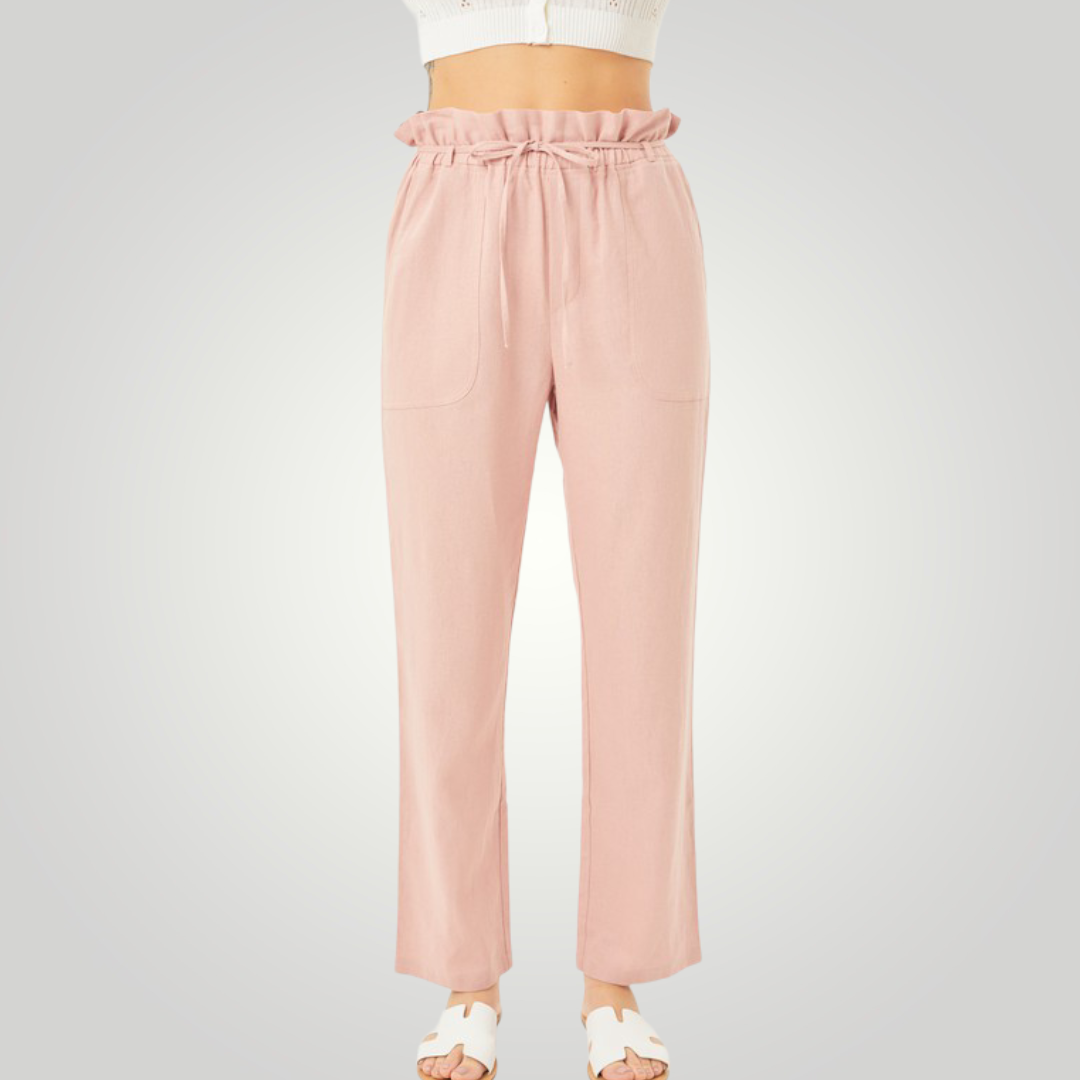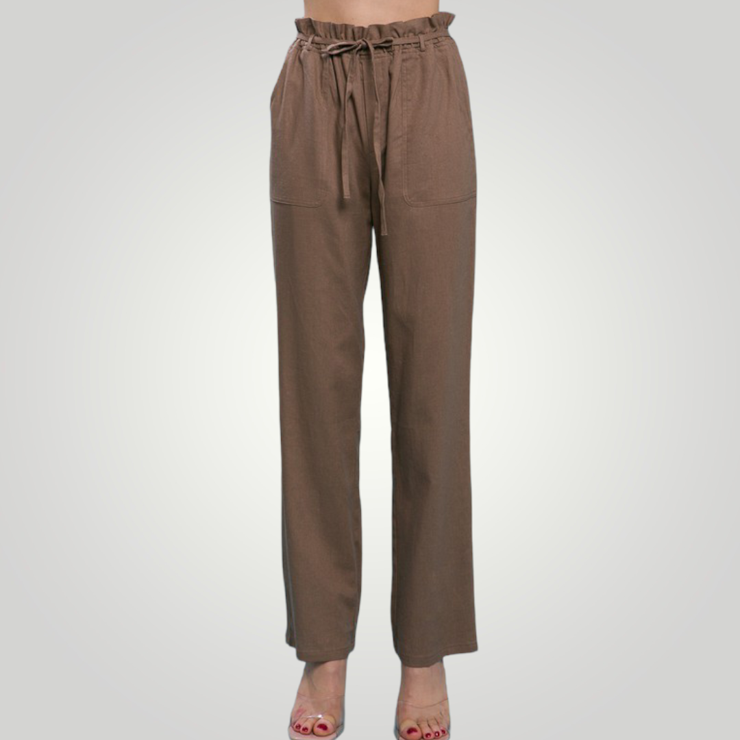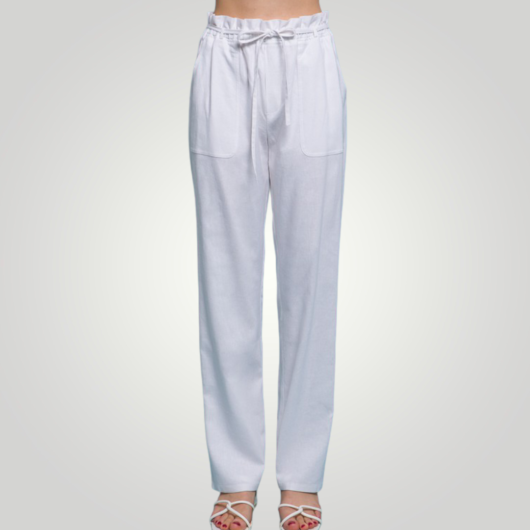 The high waist on our paperbag linen blend high rise is ultra-flattering! These beauties are crafted with a high waist and a wide pant legs. The elastic waist, side pockets, and drawstring ties add detail.