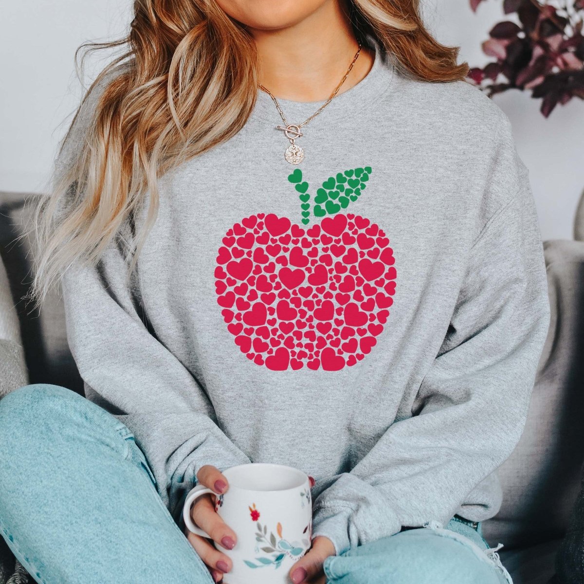 Step into a world of whimsy with this standout graphic sweatshirt. It's more than just clothing; it's a mood! Whether you're in the classroom, out with friends, or enjoying a cozy weekend at home, the Apple of Hearts Crewneck Sweatshirt is your go-to for warmth and style.