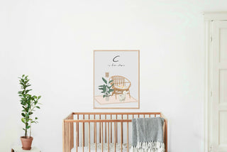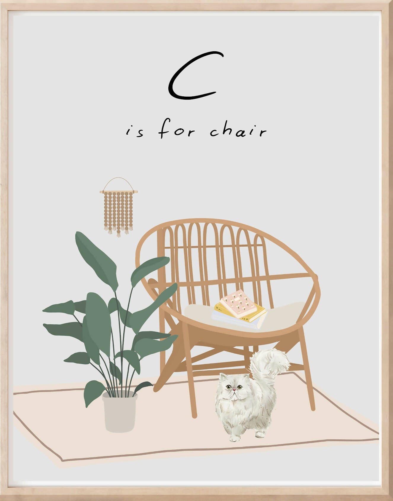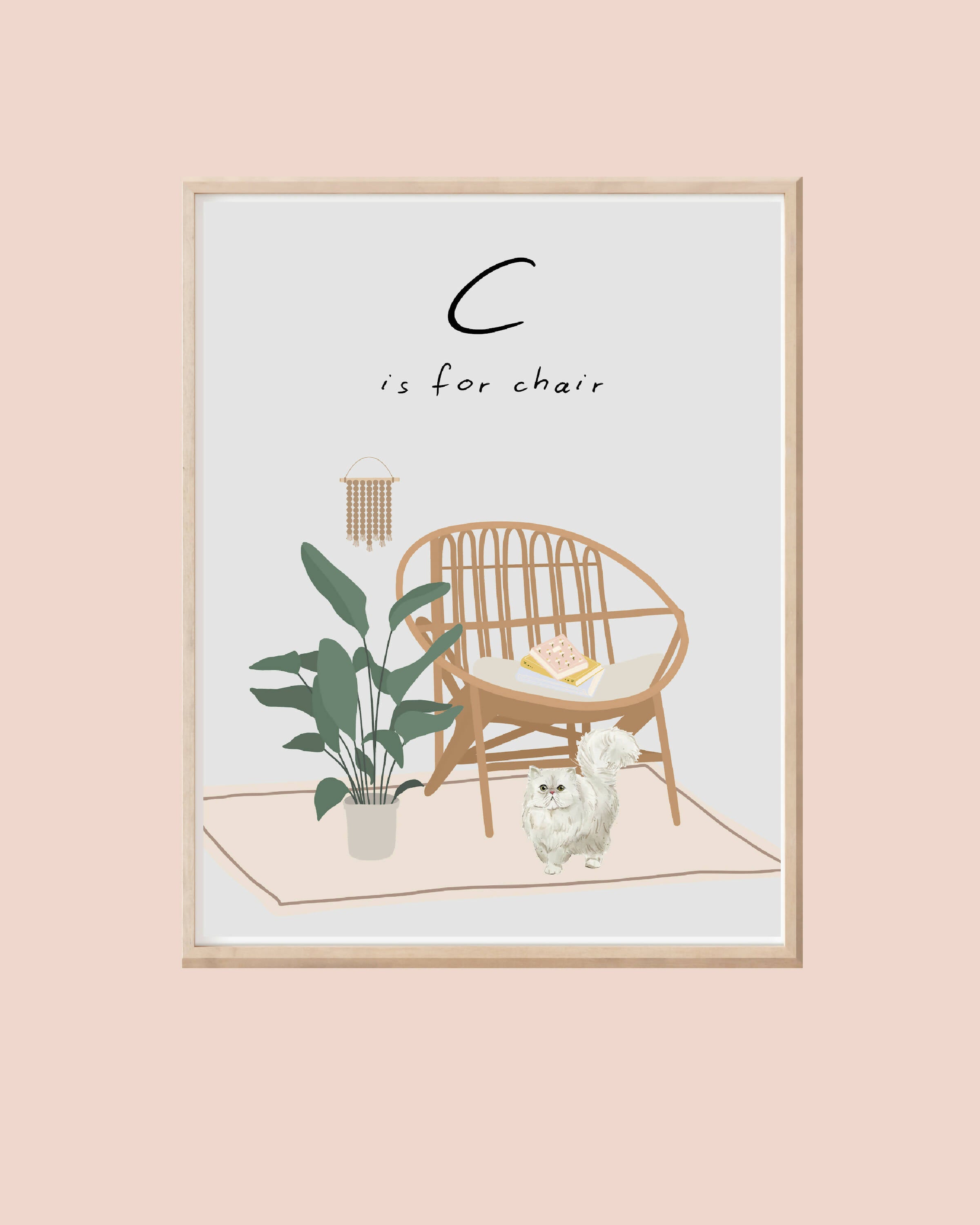C is for Chair - perfect little nursery print with a soft retro flair - featuring Mabel the cat, a rattan chair, cream rug and a plant named Andi (and a lovely stack of books)