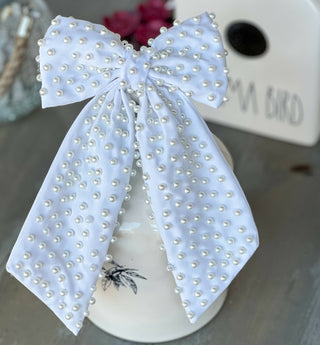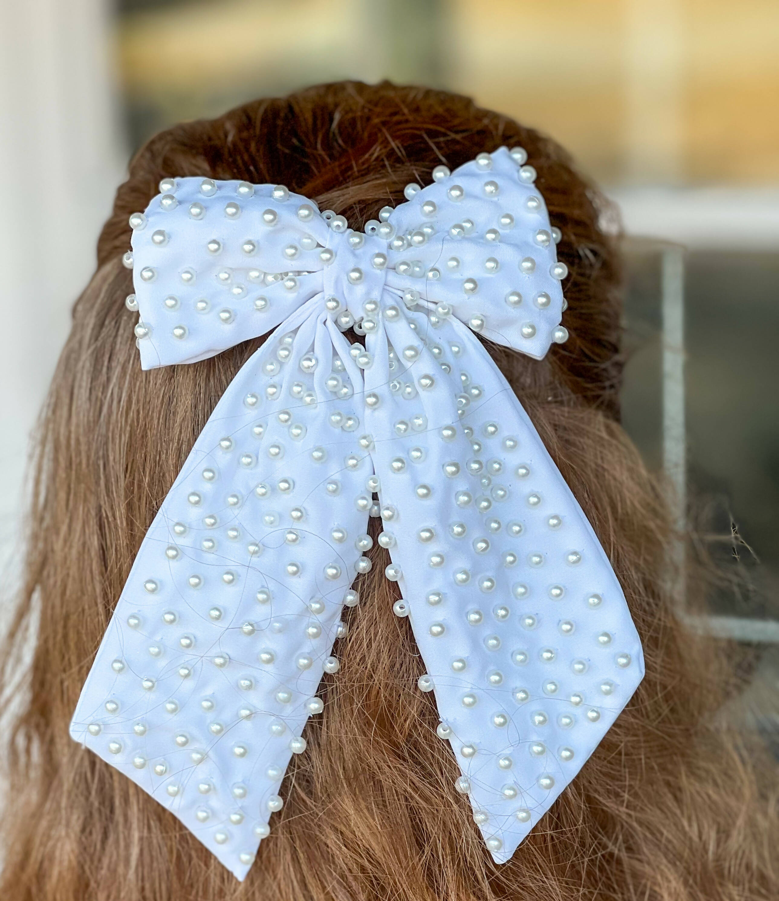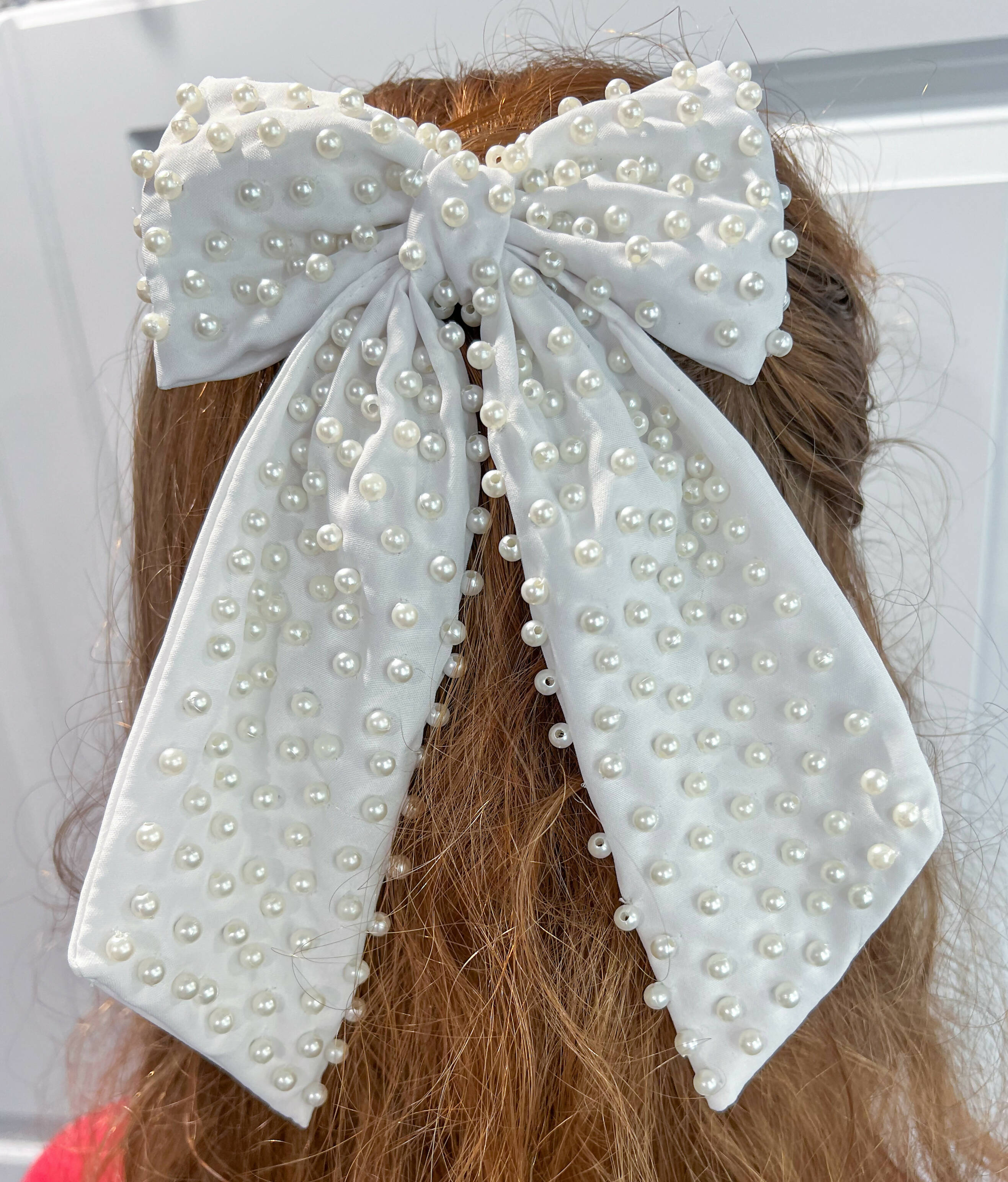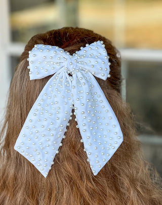 This Bella Pearl Embellished Barette Bow is beautifully hand-crafted with faux pearls, making it the perfect accessory for styling half up or ponytail hairstyles. With its alligator barrette backing and non-slip closure, this oversized bow measures 7" by 5" and adds a touch of elegance to any look.