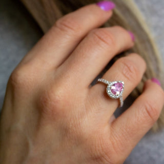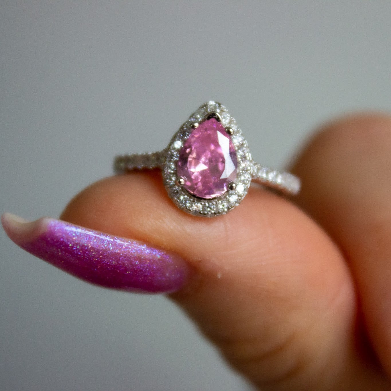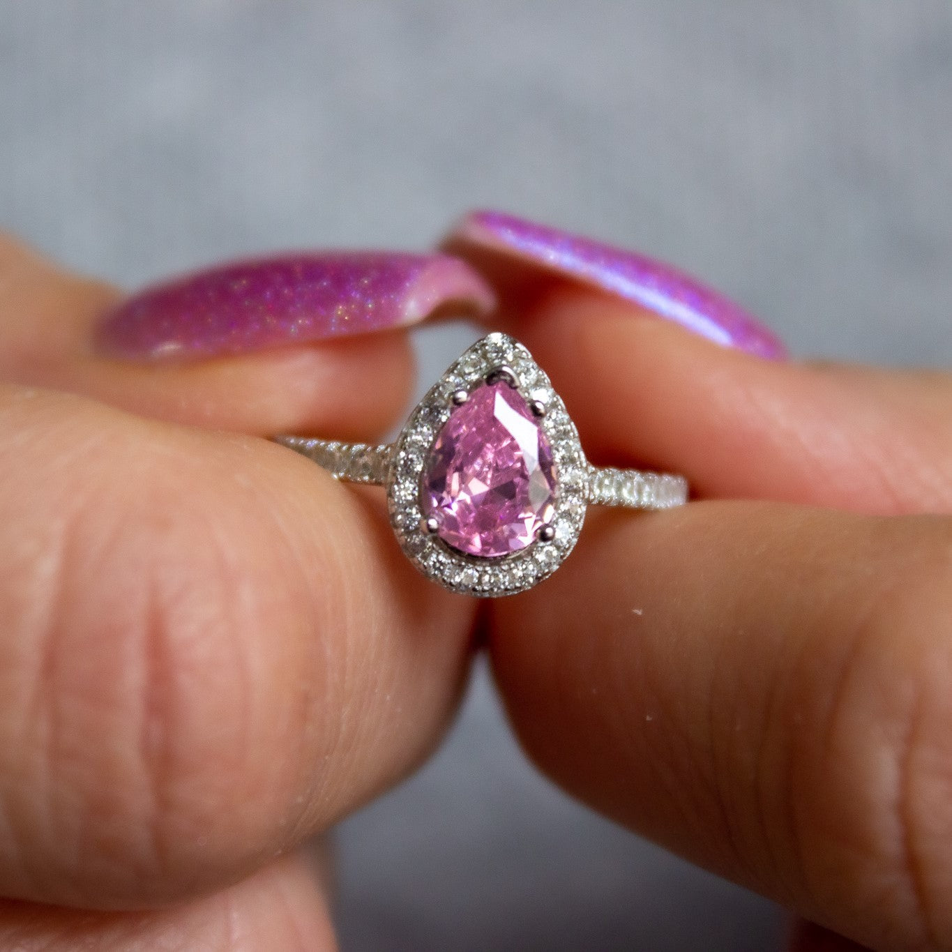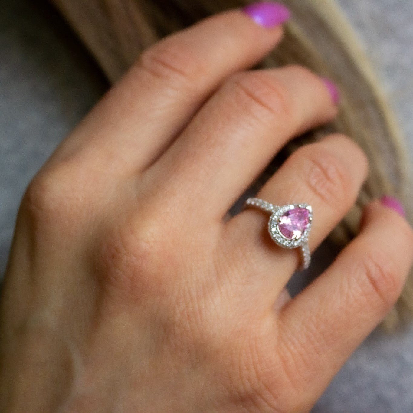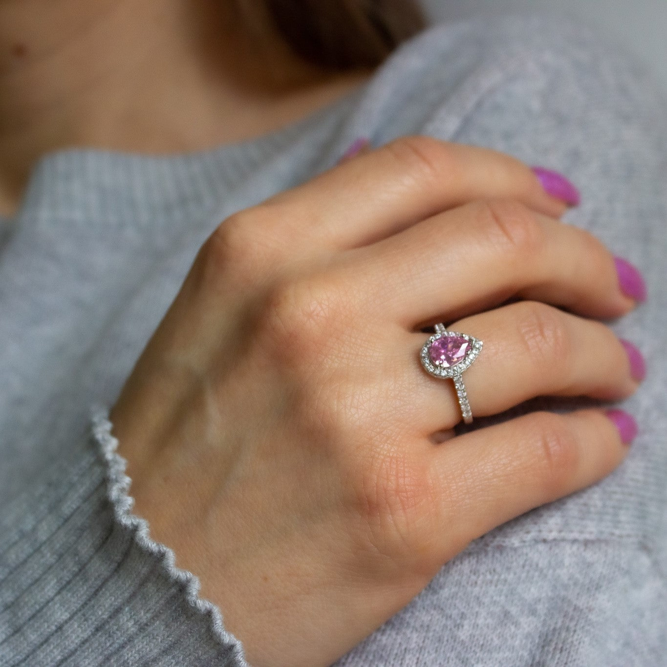The Bella features a pink pear-shaped one carat main stone in a halo setting, surrounded by small white stones.