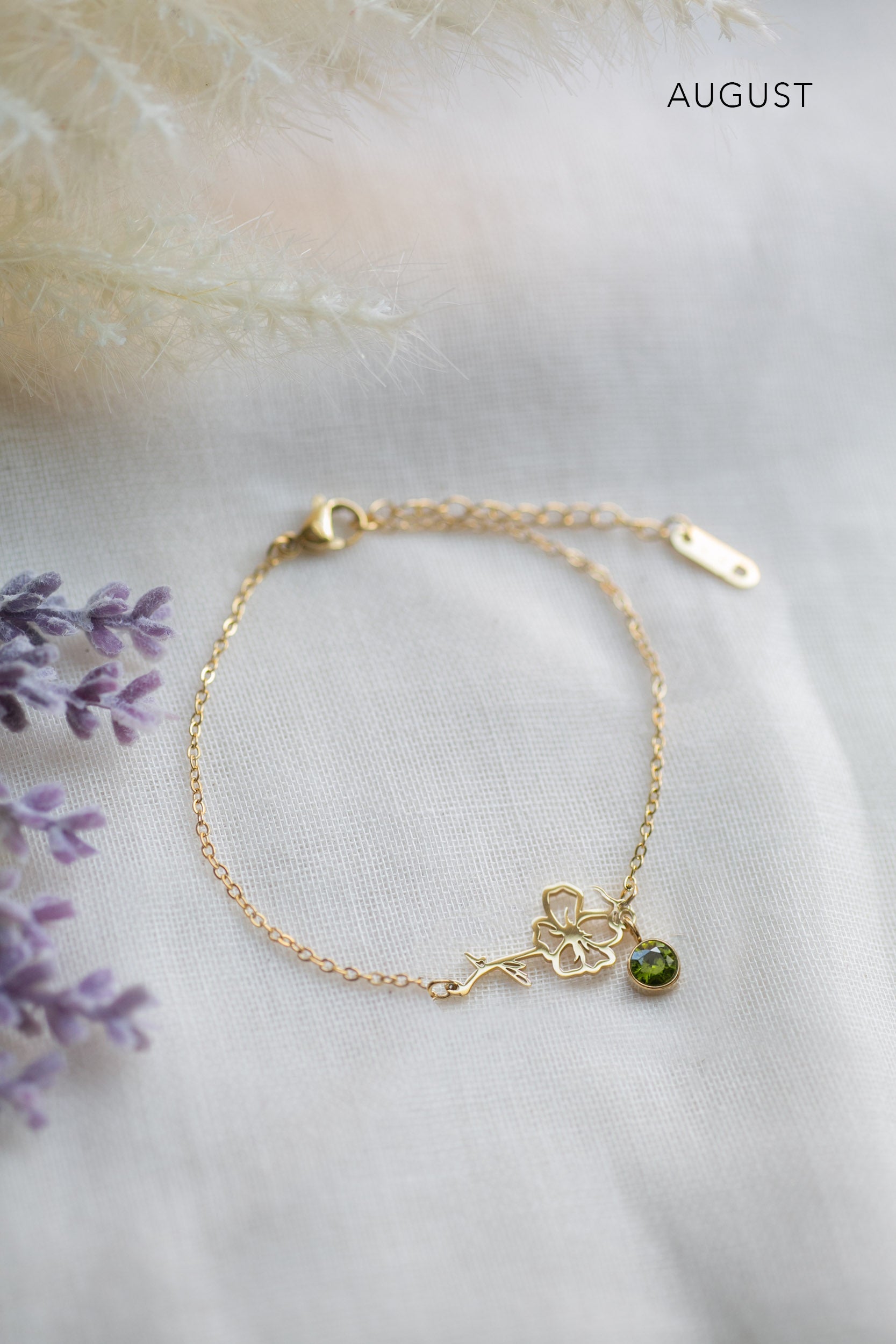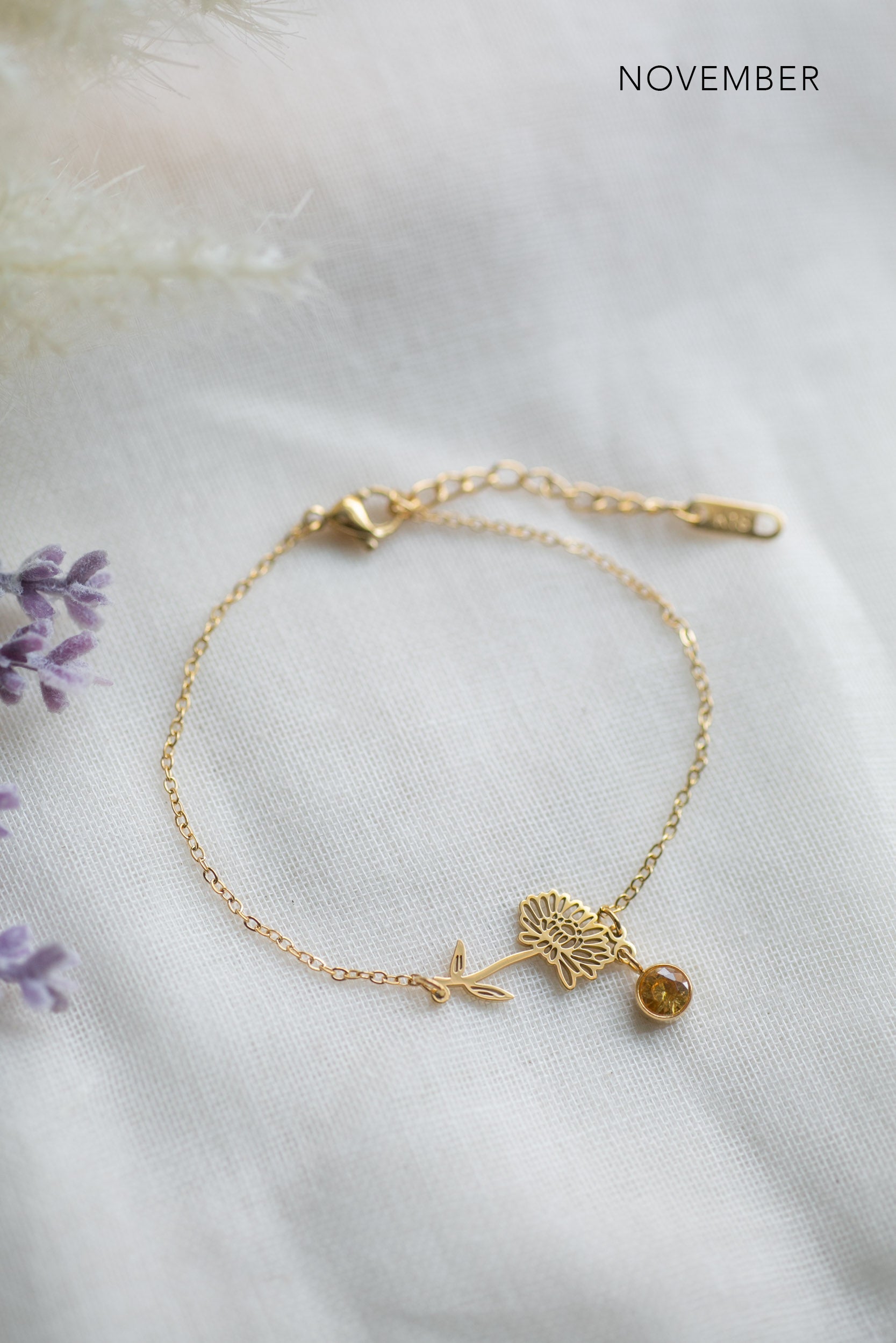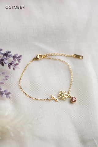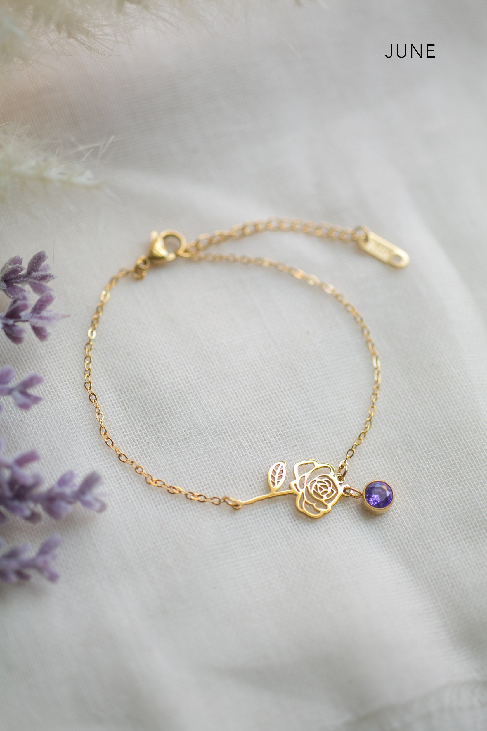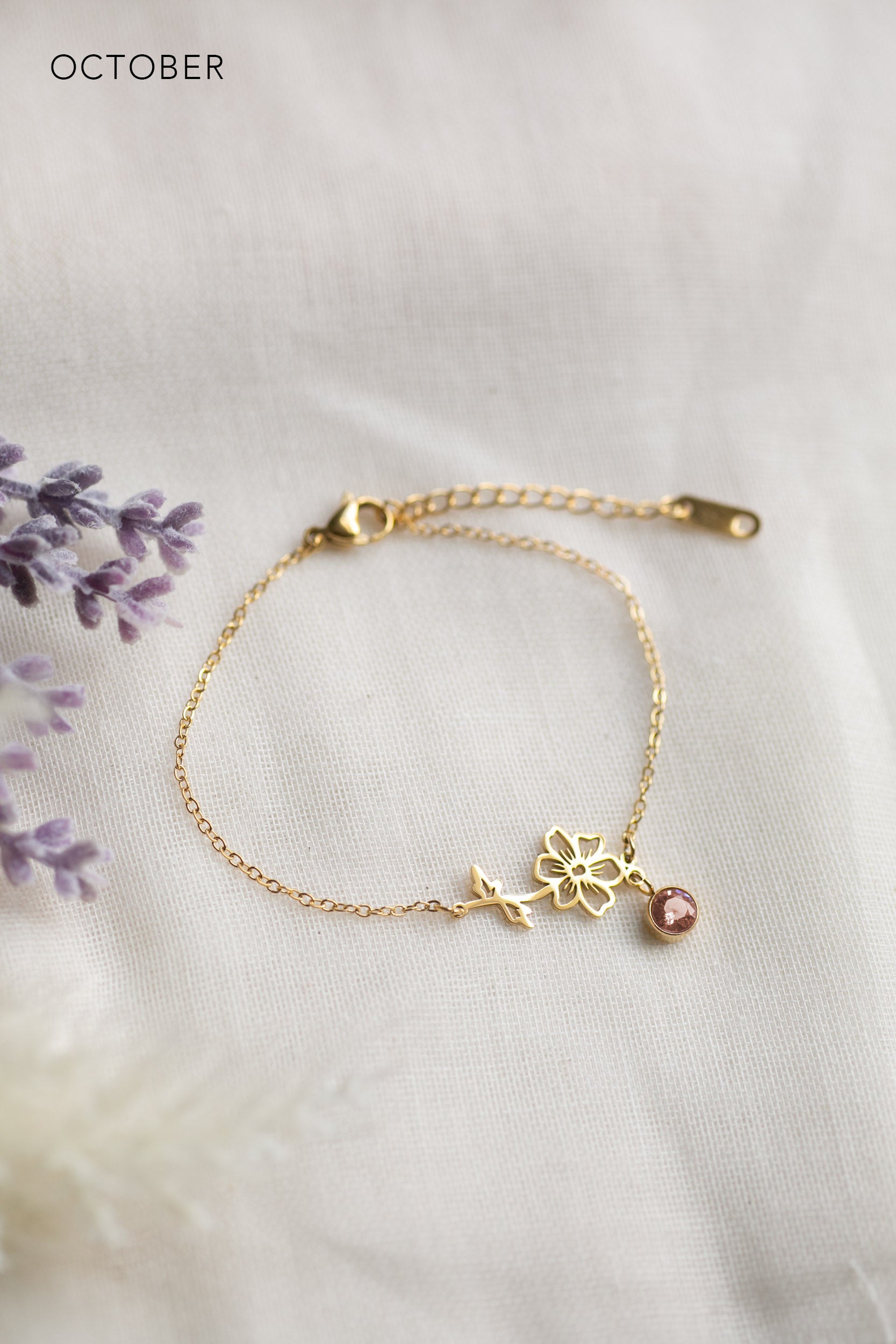 The prettiest dainty birth flower bracelet, the perfect gift for someone special! Featuring each month's birth flower accompanied by a sparkly CZ birthstone charm.