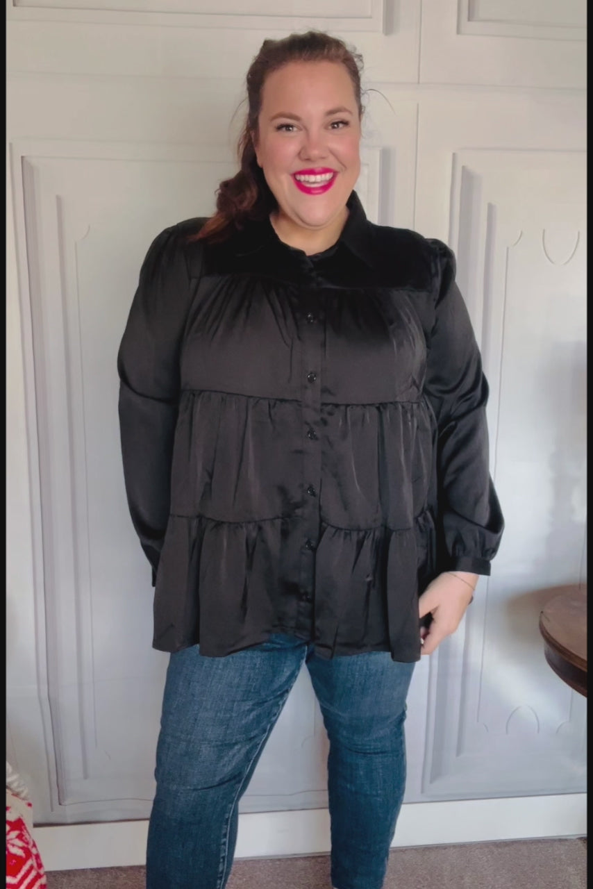 Refresh your holiday closet with the tiered babydoll top. The sleek satin material, and a button down front complete this gorgeous top.