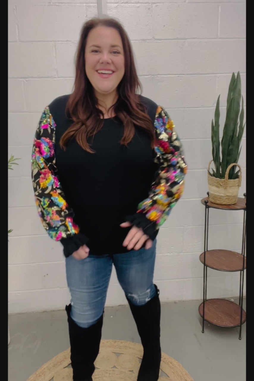 Perfect for the upcoming holiday season! This ribbed knit top with floral sequin mesh sleeves will add a touch of glam to any outfit this holiday season.