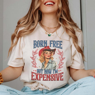 Crafted from premium fabric, this tee ensures both comfort and durability, making it the perfect choice for expressing your unique sense of humor and style. The design features a bold typographic display of the phrase "Born Free But Now I'm Expensive," capturing the essence of growth and evolution with a touch of wit.