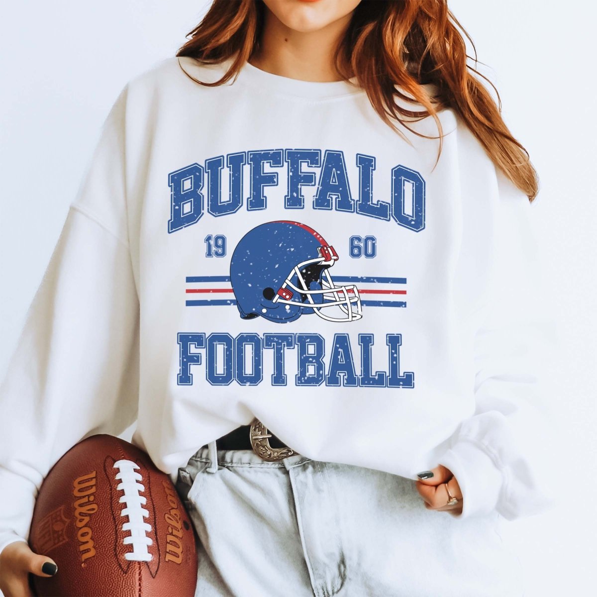 Embrace warmth and show off your passion for football with our Buffalo Football Graphic Sweatshirt. Designed with a vintage-inspired distressed look, this sweatshirt captures both style and team spirit effortlessly. Whether you're cheering from the stadium bleachers or enjoying a cozy day at home, this sweatshirt is your go-to choice.