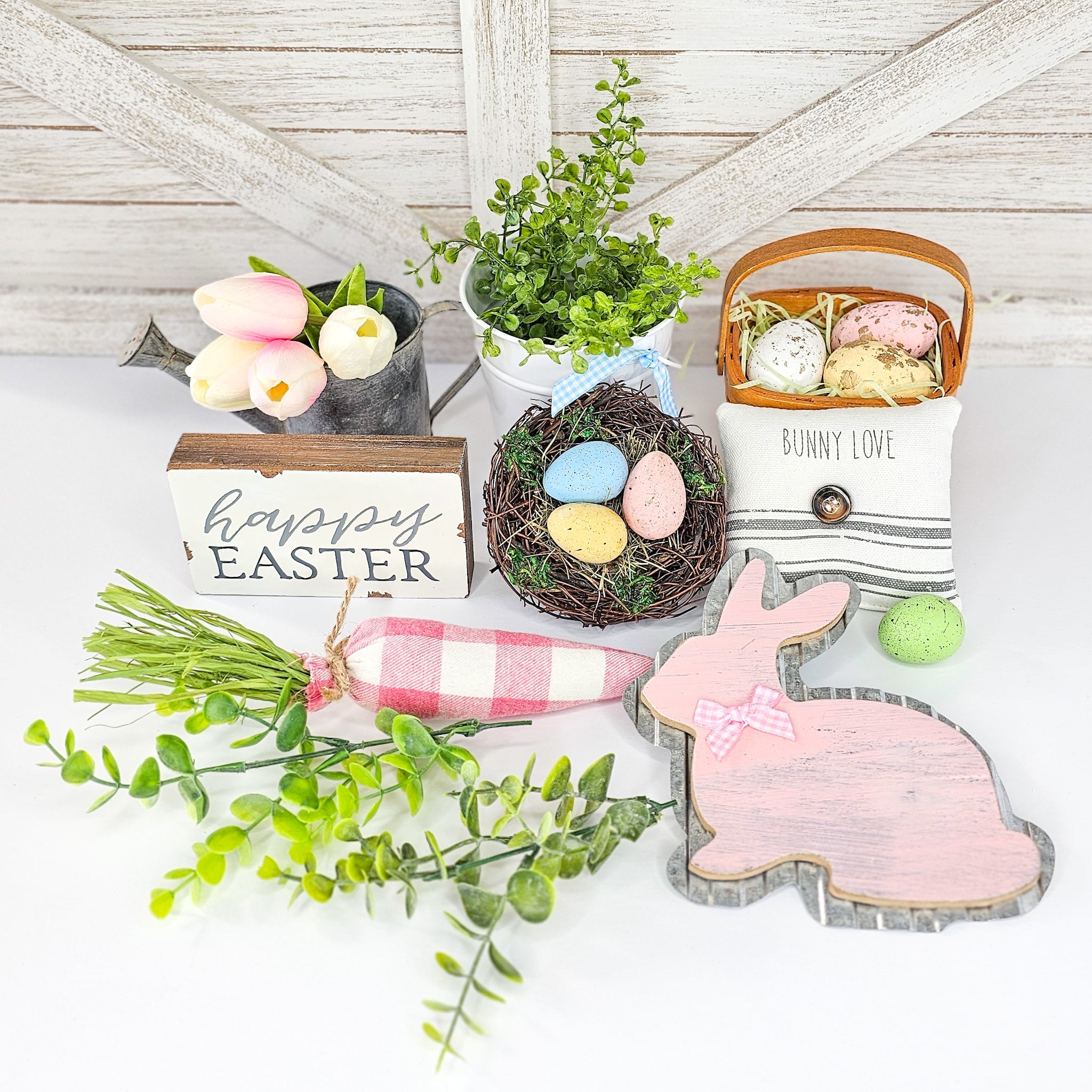 Transform your tiered tray, shelf or mantel into a stunning display with our Bunny Love decor set. With a variety of heights, colors, and textures carefully selected for perfect coordination, this set offers unbeatable value. Why spend time hunting for matching pieces when we've done it for you? Simply sit back and watch as your space is transformed with ease!