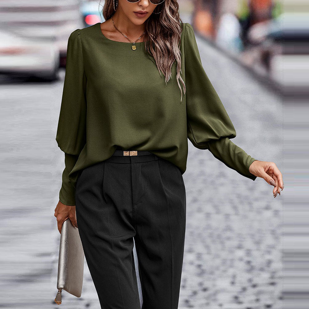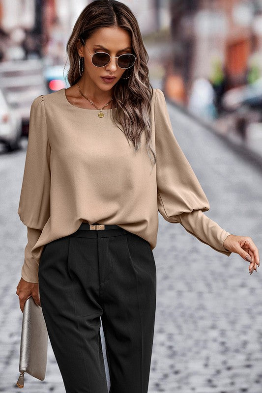 The Buttoned Grace Blouse blends sophisticated design with ultimate comfort. It features a round neck, long sleeves with a chic button-back detail, and stylish long buttoned cuffs. With pleated shoulders and a relaxed fit, this blouse offers a graceful silhouette at hip length. Crafted from silky soft woven fabric, it's perfect for any occasion.