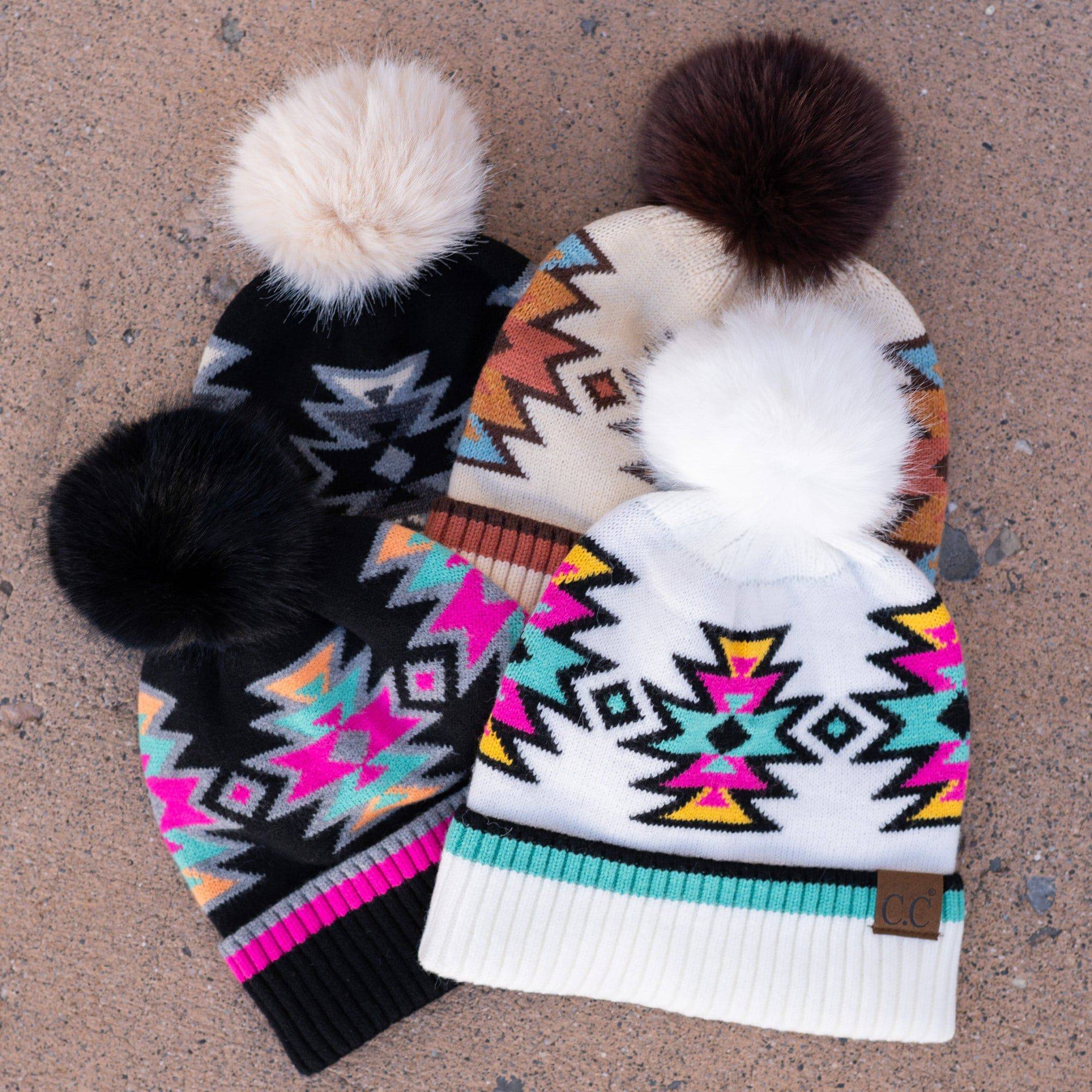 Stay warm and stylish with the CC South Western Pattern Faux Fur Pom Beanie. With authentic C.C.® Branding & Quality, this classic beanie adds a bold touch to chilly days with its quality faux fur pom and eye-catching South Western pattern. Fitting older kids to adults, this beanie is an essential winter accessory.
