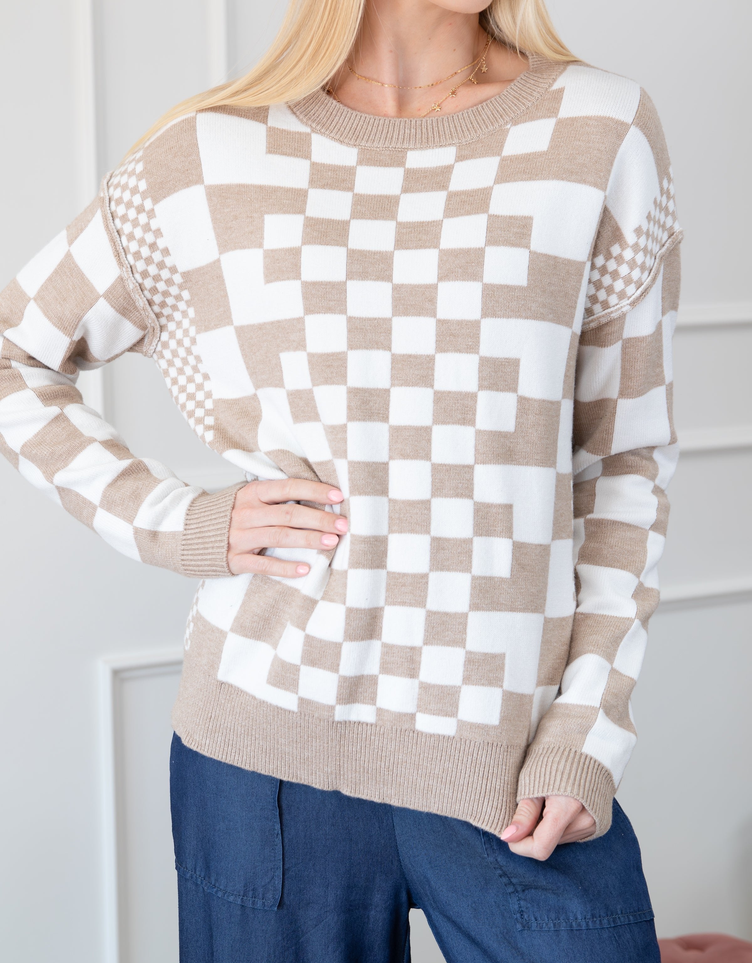 Elevate your style with our Checkered Drop Shoulder Round Neck Sweater. The bold two-tone print catches eyes, while the relaxed drop-shoulder design offers a modern silhouette. Our soft and cozy material keeps you warm on chilly days without adding bulk. Pair with denim or tailored pants for a stylish and comfortable.