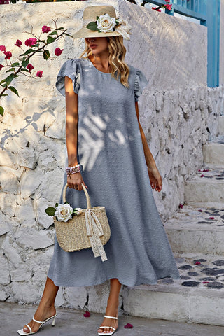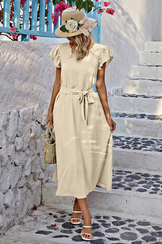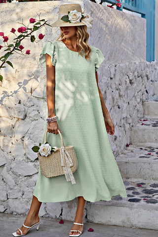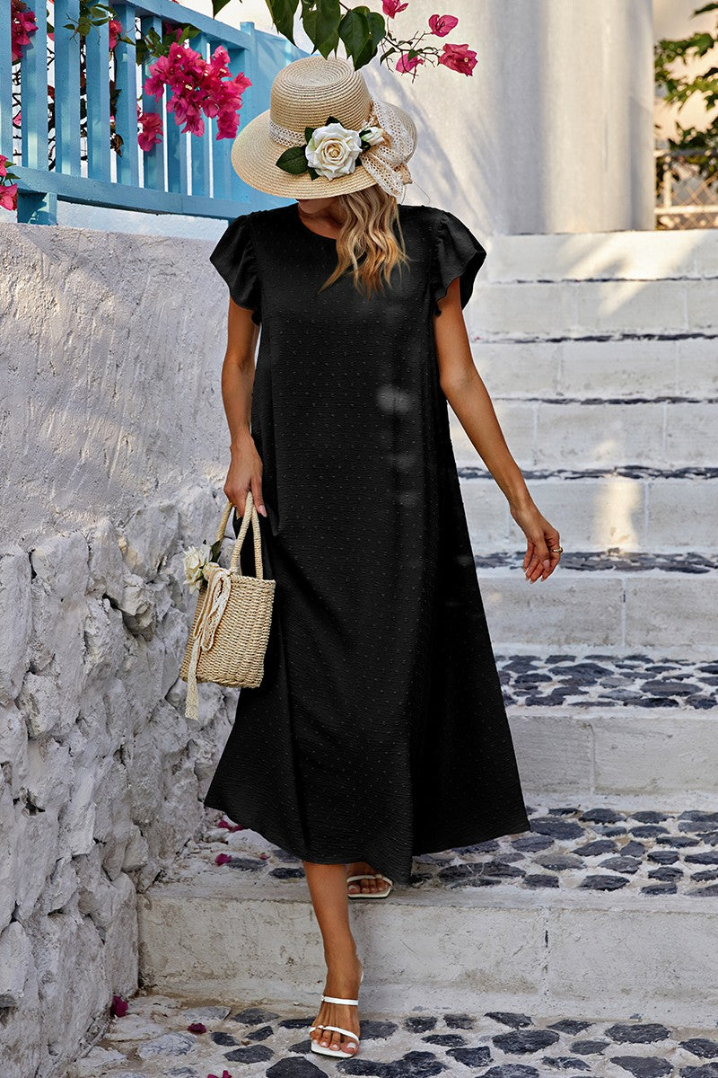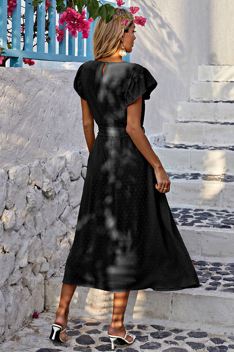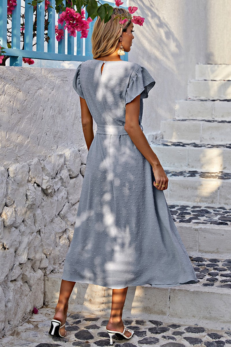 Introducing our Chic Ruffle Bliss Midi Dress! Elevate your wardrobe with this stylish piece featuring a round neck and charming short ruffled sleeves. Designed with a loose fit A-line silhouette and a removable belt for added style versatility. Crafted from textured dotted woven fabric, this dress offers a relaxed yet chic look. Say hello to your new favorite midi dress!