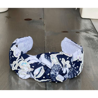 Classic Navy and White Floral Sequin and Seed Beaded Top Knot Headband. OBX Prep Exclusive.