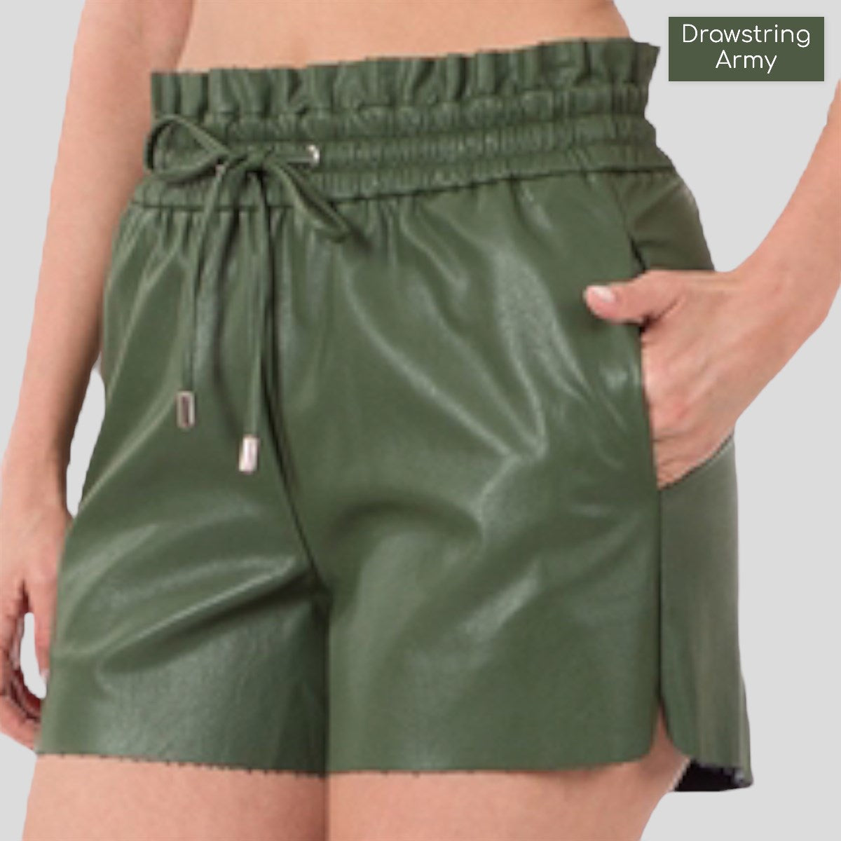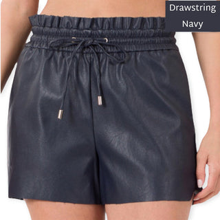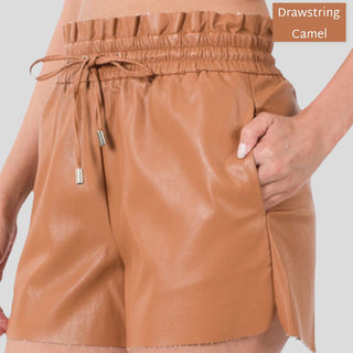 These high-rise shorts are cut from faux leather with elastic inset pleats at the waist and self tie belt.
