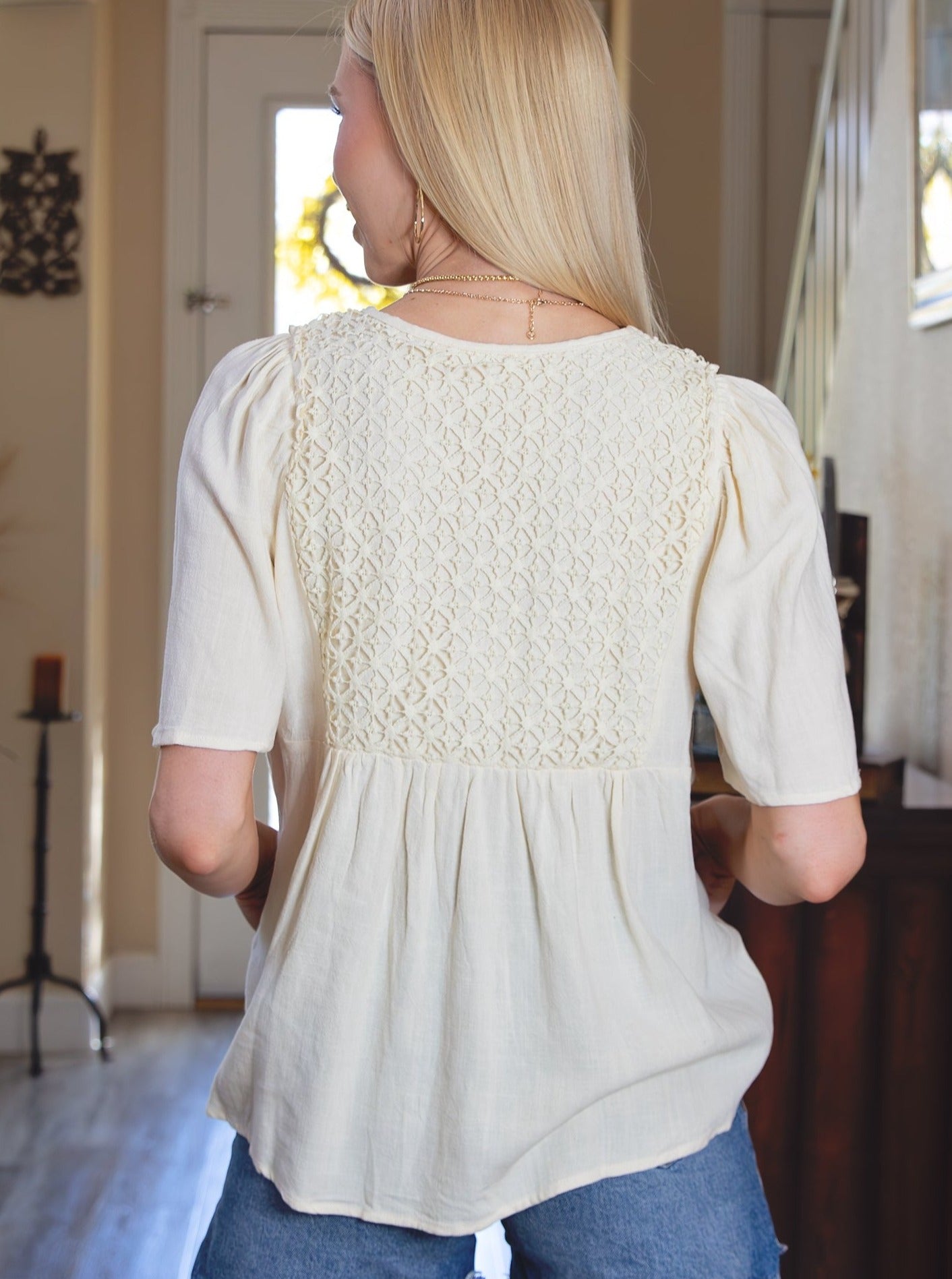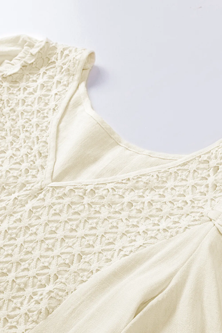 Achieve a laid-back boho style effortlessly with our V-Neck Crochet Detail Babydoll Top. This charming top showcases a V-neckline, short dolman flutter sleeves, a delicately crafted crochet lace bodice, and a high-low hem. Its elegance and flattering design make it a perfect match for jeans, shorts, or fitted pants. Wear this blouse confidently to exude grace and charm in any crowd.