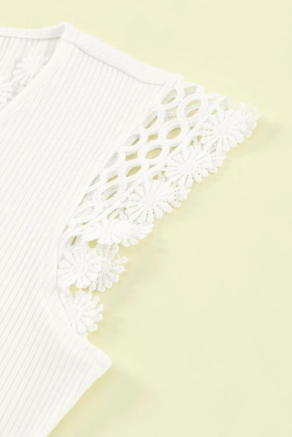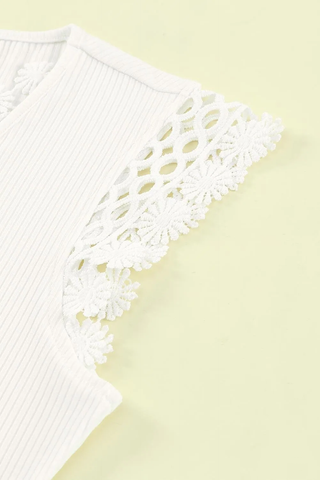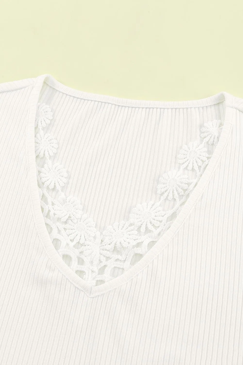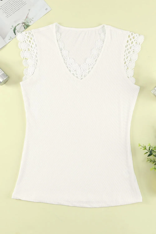This pretty V-neck tank top has delicate lace crochet on the sleeves and neckline. It's sleeveless, slim-fitting, and designed for most women's shapes. The top is made of soft, lightweight, and skin-friendly fabric for a comfortable feel. You can easily pair the ribbed knit top with jeans, a necklace, and sneakers.