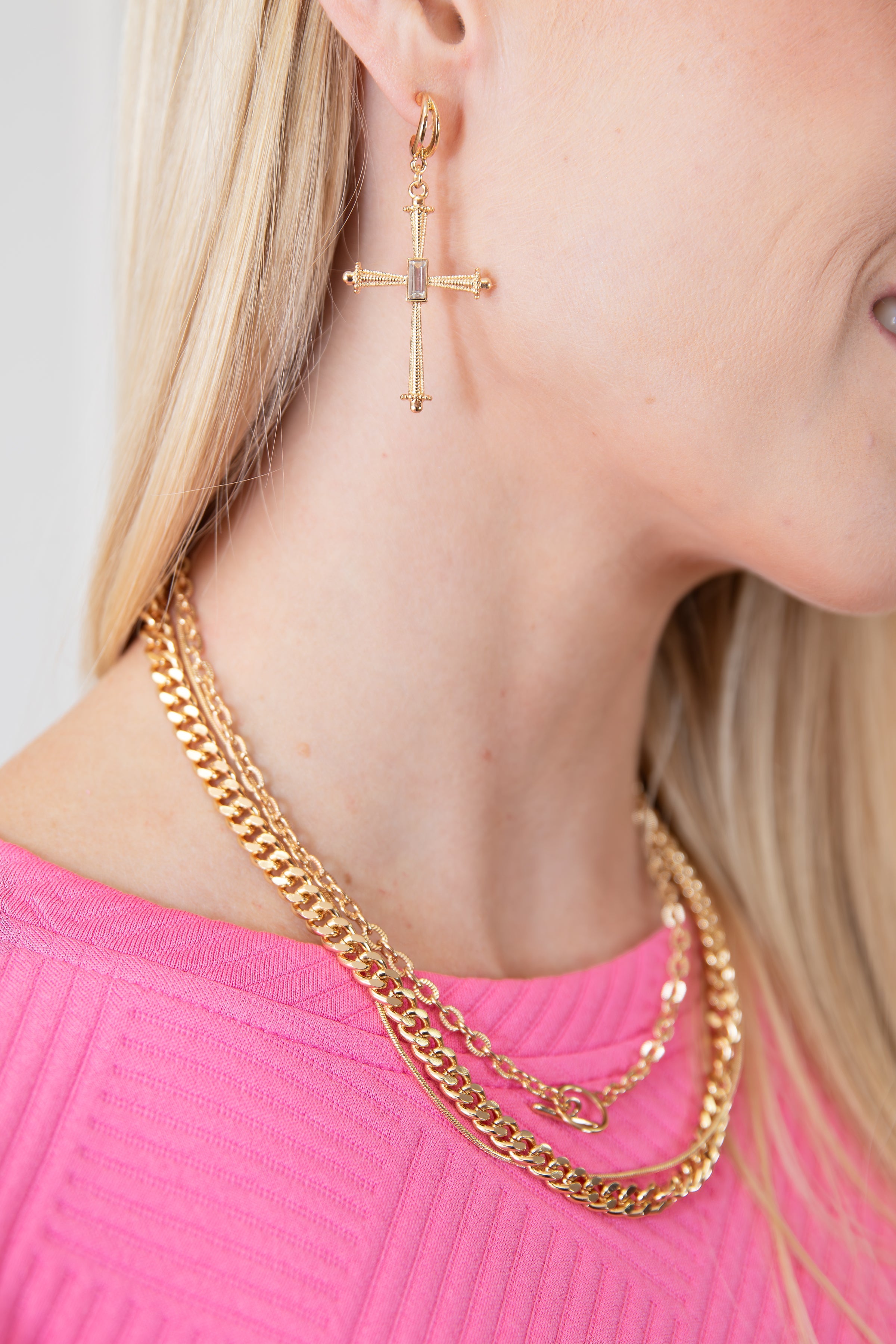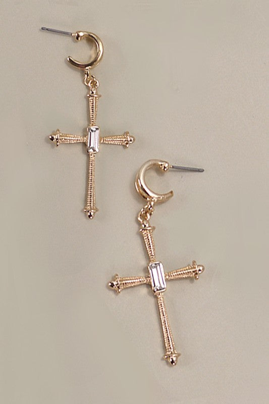 Transform your look with our Cross Rhinestone Drop Hoop Earrings. The perfect combination of sophistication and shine will bring a touch of luxury to every outfit. Adorned with dazzling rhinestones, a delicate cross charm makes these earrings stand out. Made with premium materials, these huggie hoops will elevate any style.