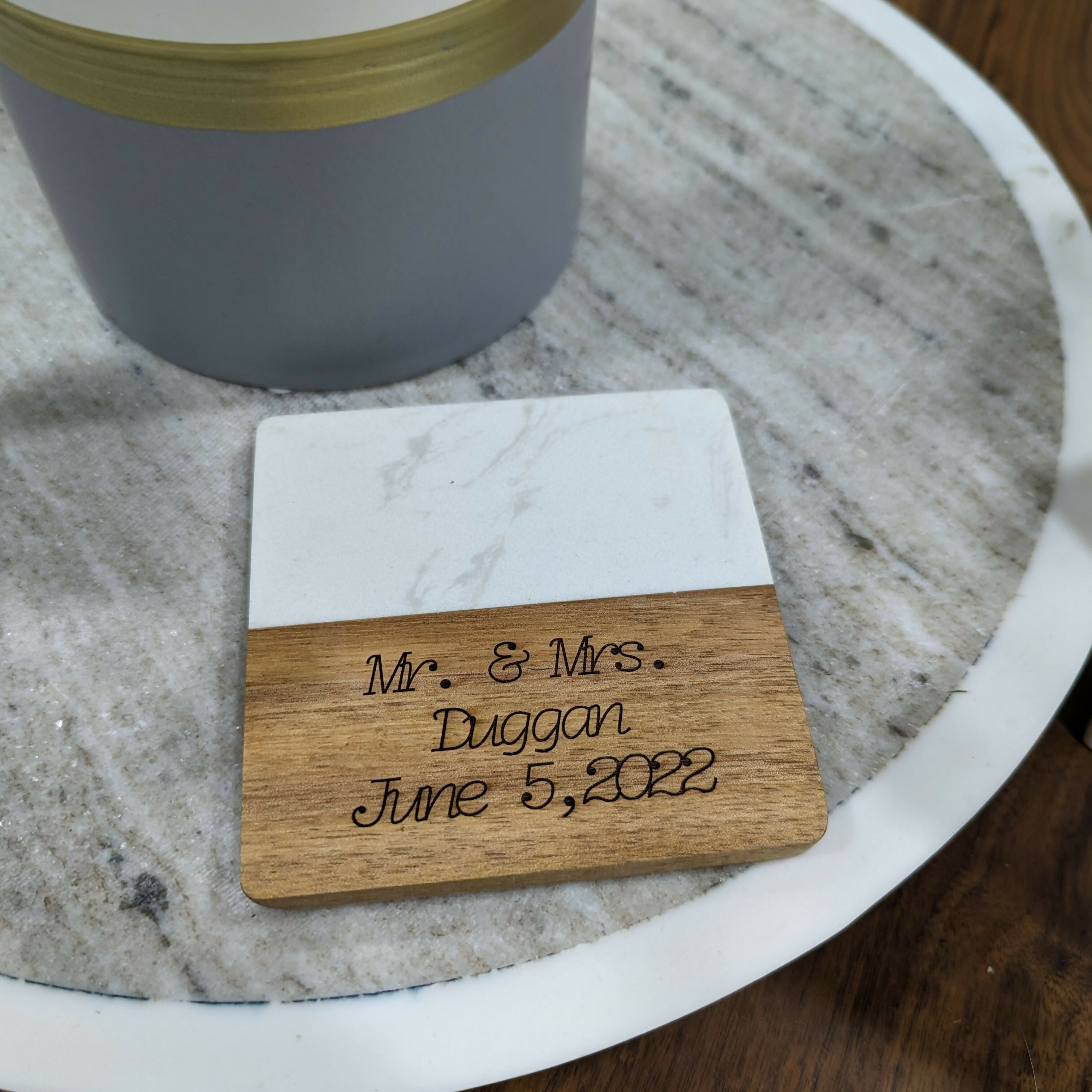 You chose what you would like engraved on these white marble and wood coasters. They come in a set of 4 coasters. Please make sure to double check the spelling of what you would like engraved.