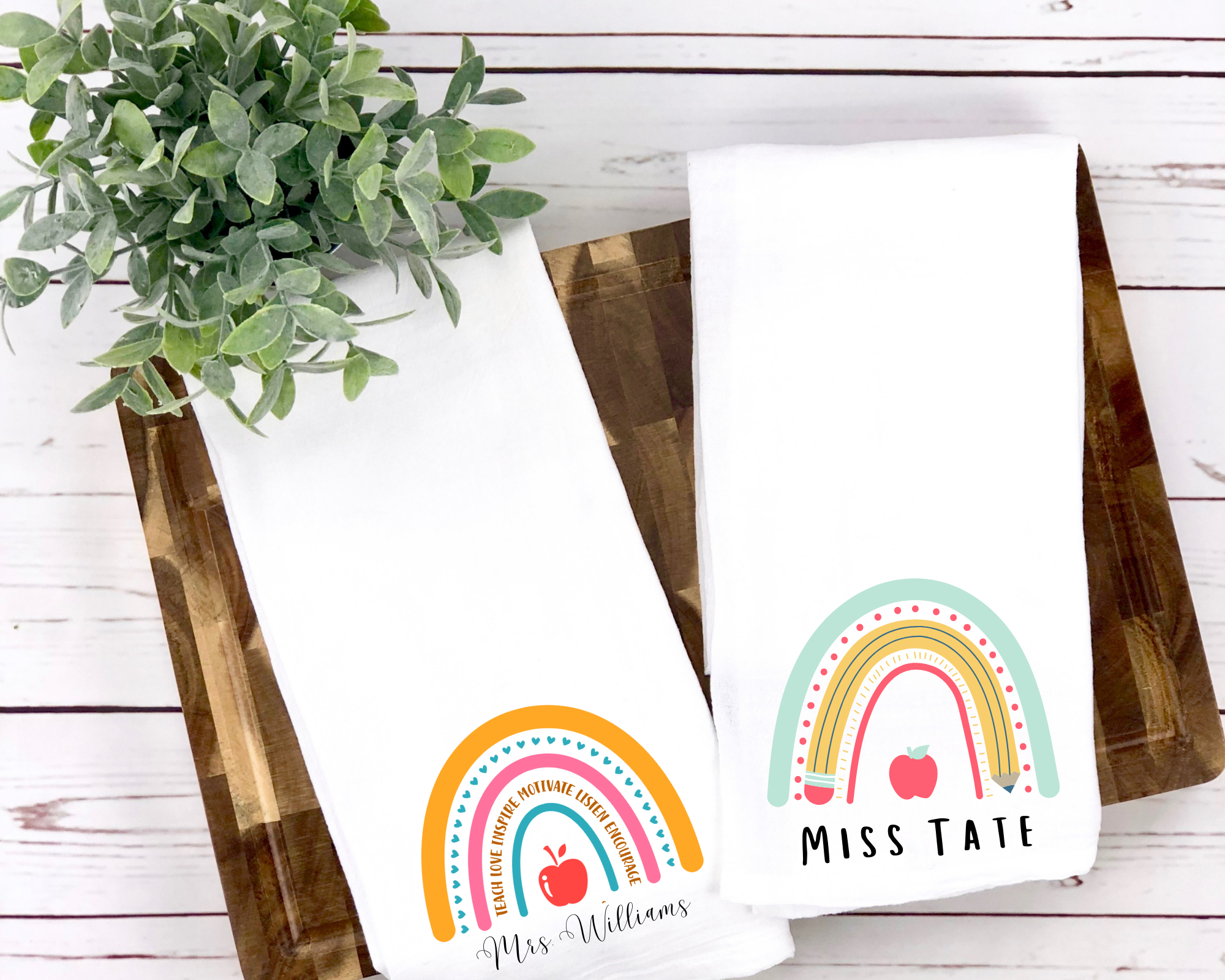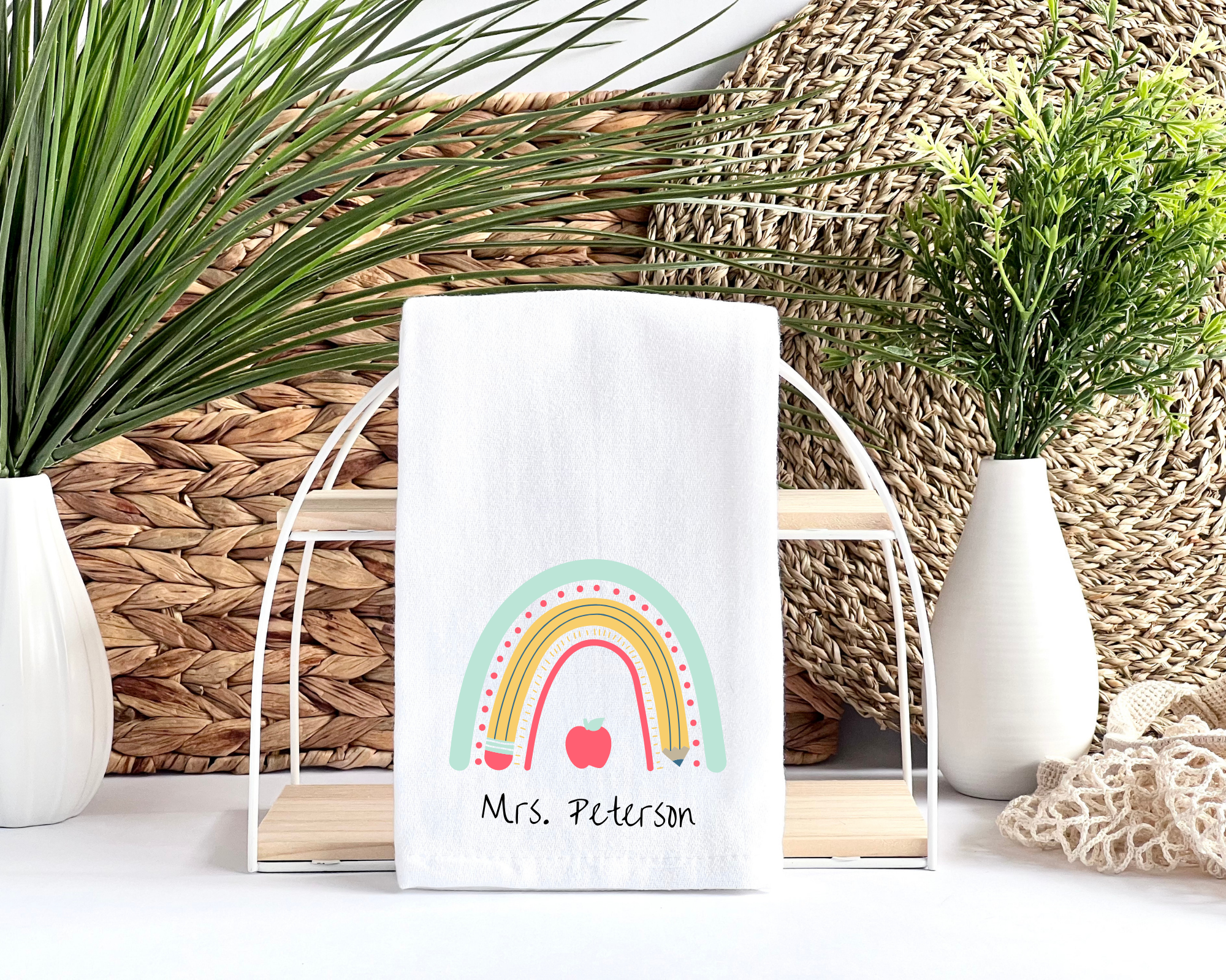 Introducing our delightful Custom Teacher Tea Towels, where you get to create your own custom towel for that wonderful teacher! We all know that teachers are momumental in our kids lives! These towels help them to feel extra special! Choose from 4 charming design options: Each design is lovingly crafted with vibrant colors and playful motifs, capturing joy and warmth. These towels are sure to bring smiles to your teachers faces.