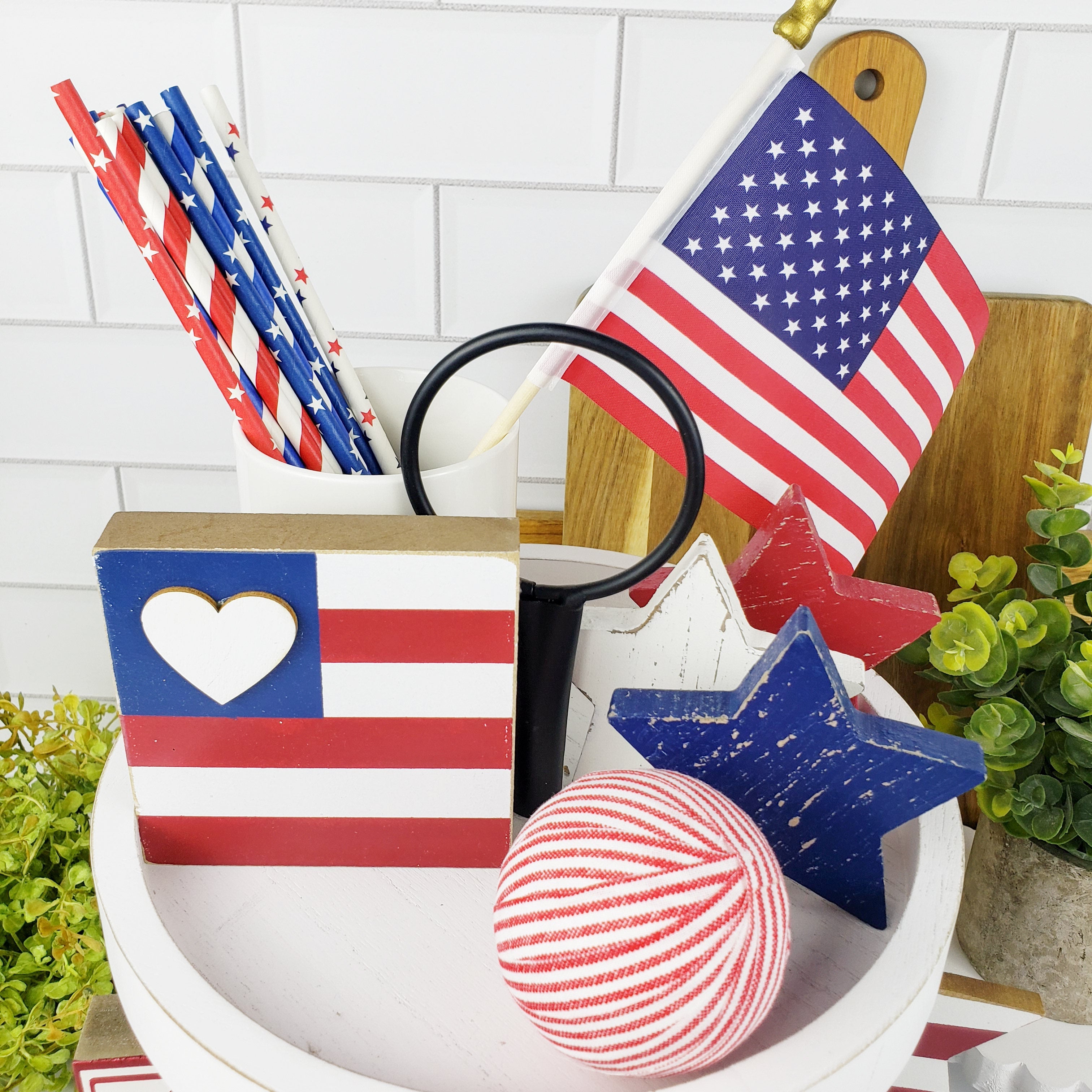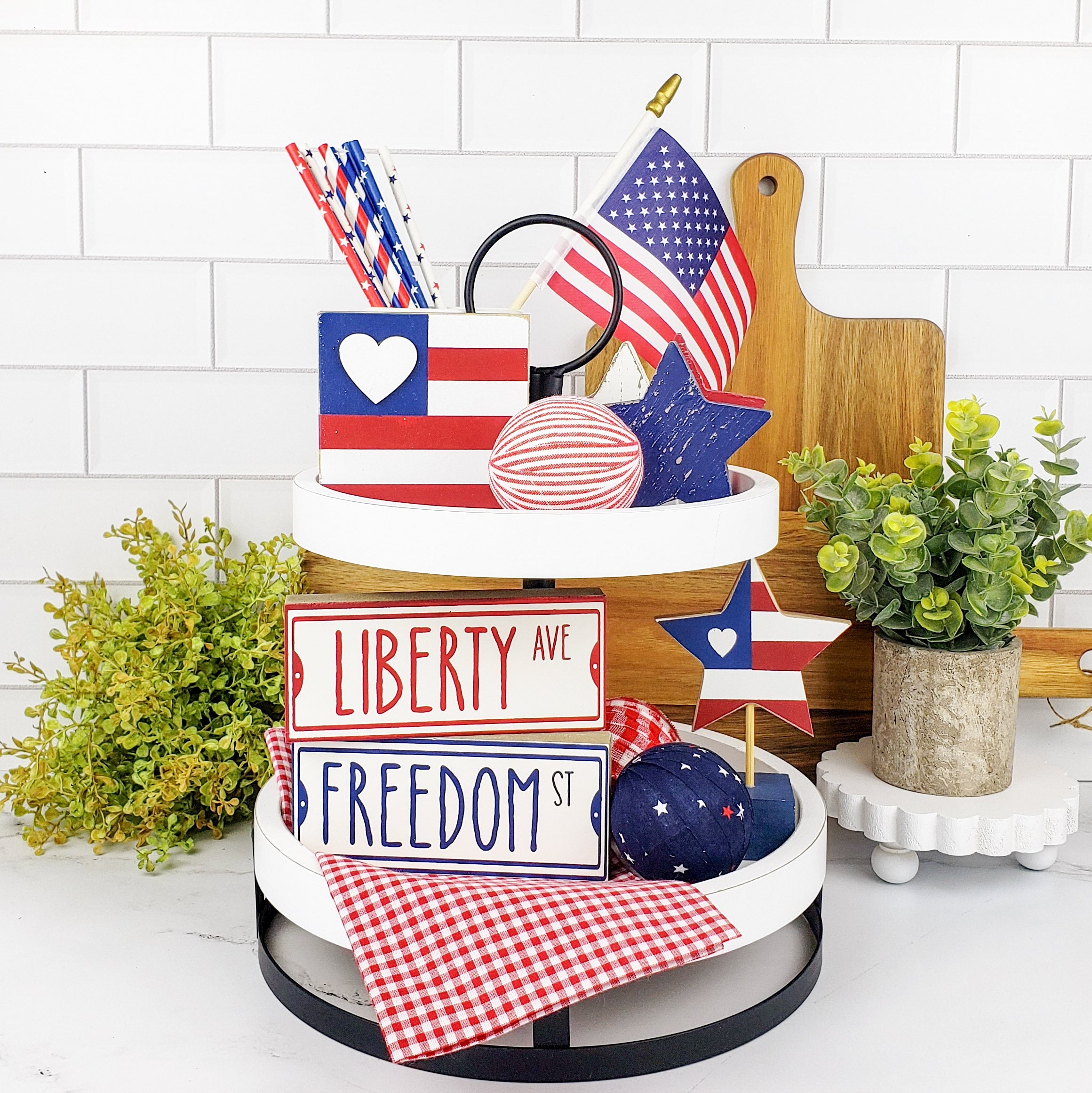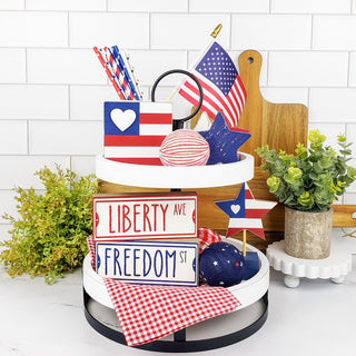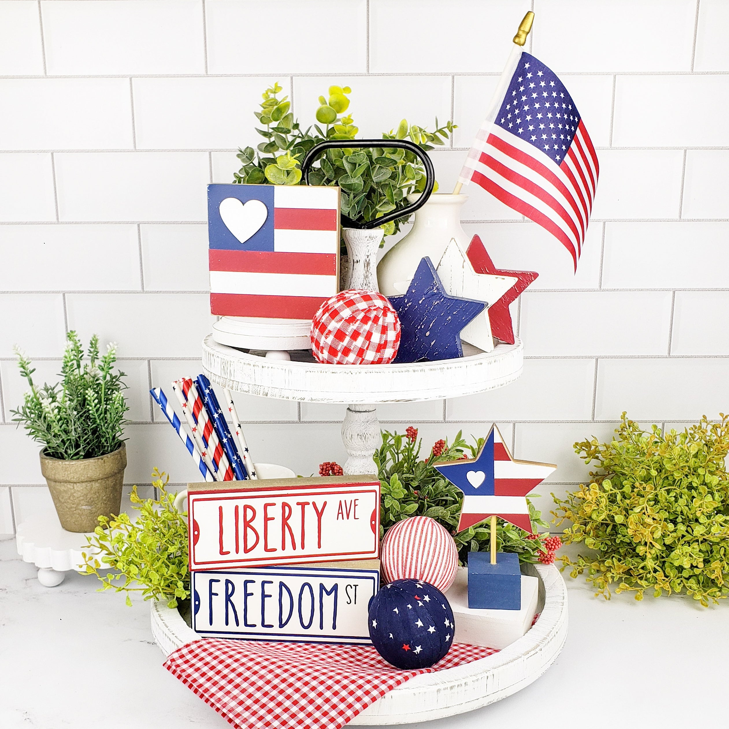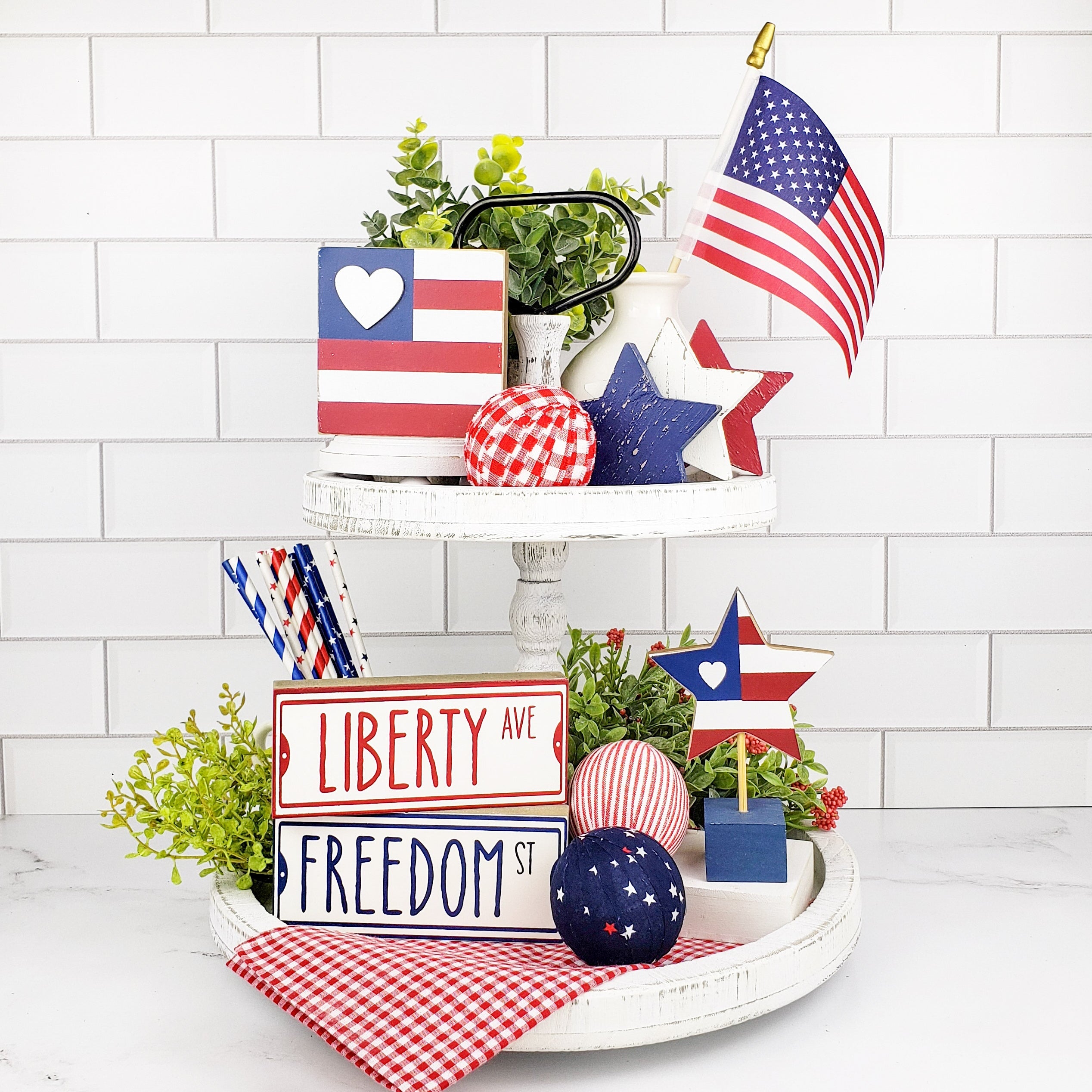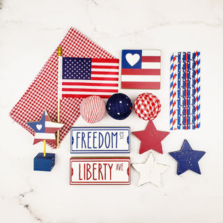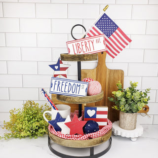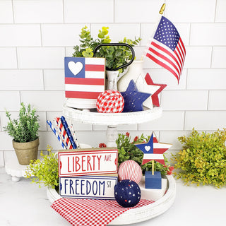 The Liberty décor set will add a touch of patriotic style to any space. Featuring red, white, and blue colors, this set will fill your home with a sense of American pride. Showcase your patriotic spirit with this beautiful décor set that is perfect to display on a tiered tray, shelves or in a vignette. You will use this timeless décor year after year for all of the holidays celebrating the red, white and blue.
