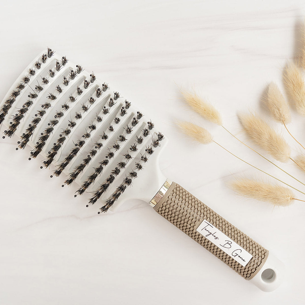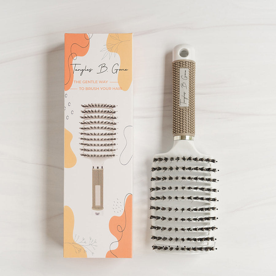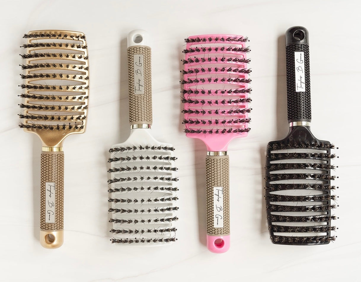 The Tangles B Gone brush is a game-changer when it comes to detangling hair! With its unique combination of boar hair bristles and nylon quills, it effectively releases tangles without pulling on the scalp. The boar bristles also distribute natural oils evenly and remove dandruff or dirt, while the nylon quills provide a soothing massage that promotes healthy blood flow to the head.