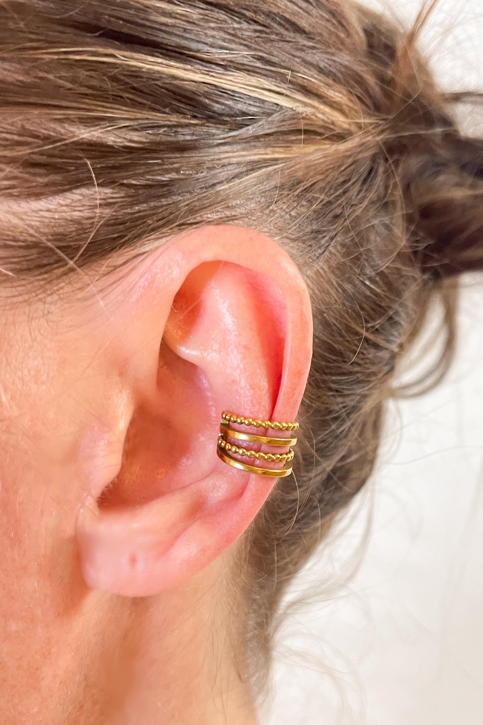 Add some effortless style to your look with our set of 3 stainless steel gold plated ear cuffs! This set includes a quadruple cuff, silver dotted cuff, and double cuff, perfect for adding a touch of edge to your ensemble without the need for a piercing. It also makes a great gift for any fashion-forward friend!