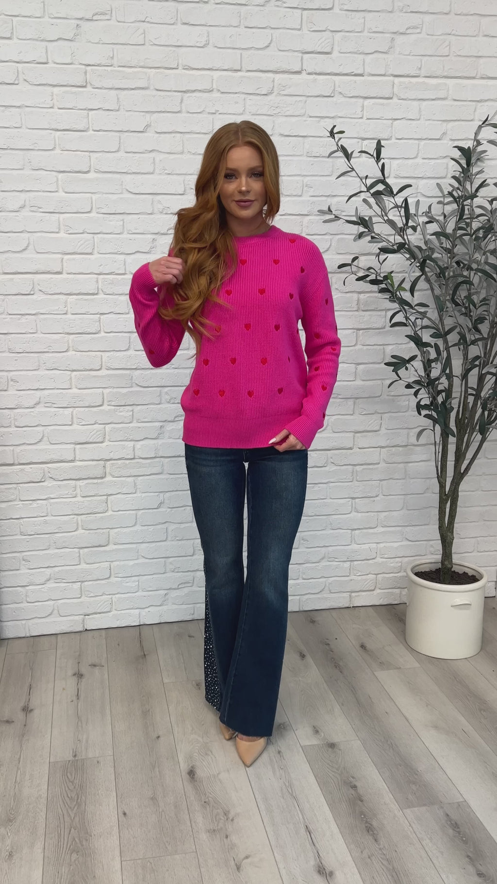 Get ready to fall head over heels for our Eat Your Heart Out Crewneck Sweater! Made from cozy sweater knit, this sweater features a round neckline and a playful drop shoulder design. The adorable machine embroidered hearts add a touch of whimsy, while the banded sleeve cuff and hemline provide a snug fit. It's perfect for spreading love and laughter on chilly days!