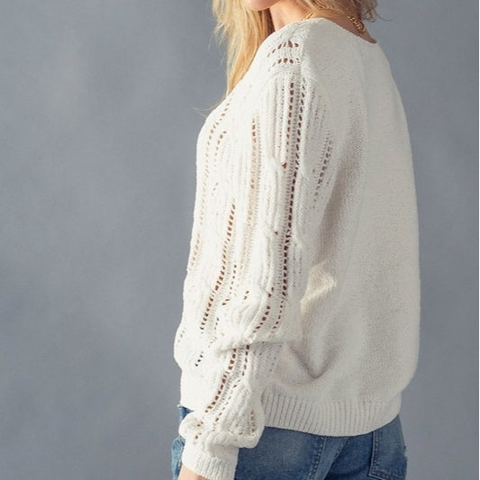 Add soft earth tones to your sweater collection in the Esley Cable Knit Pullover Sweater. This sweater features a V-neckline and ribbed edges.