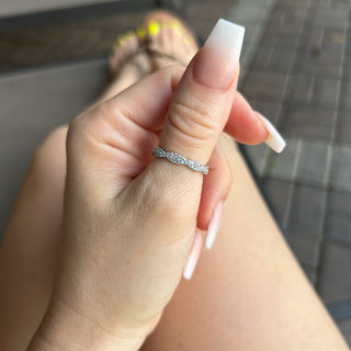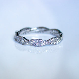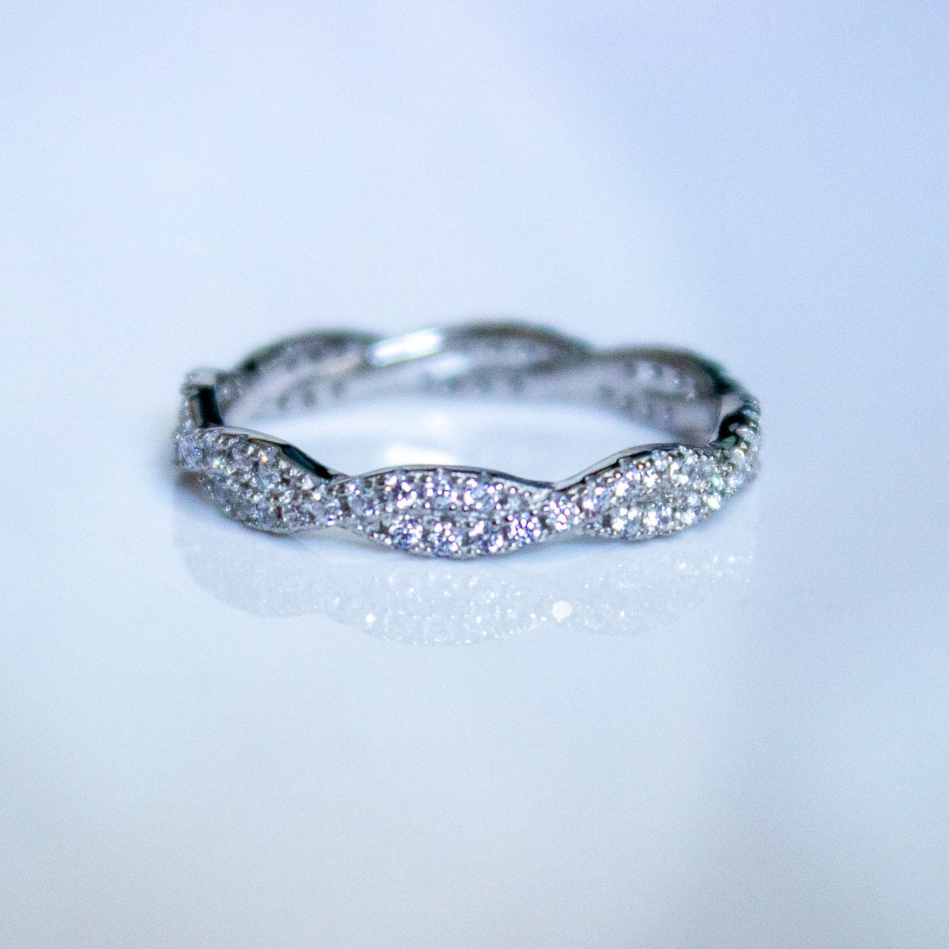 The twist band represents the love of two people intertwined for eternity. Features two cubic zirconia bands twisted together.