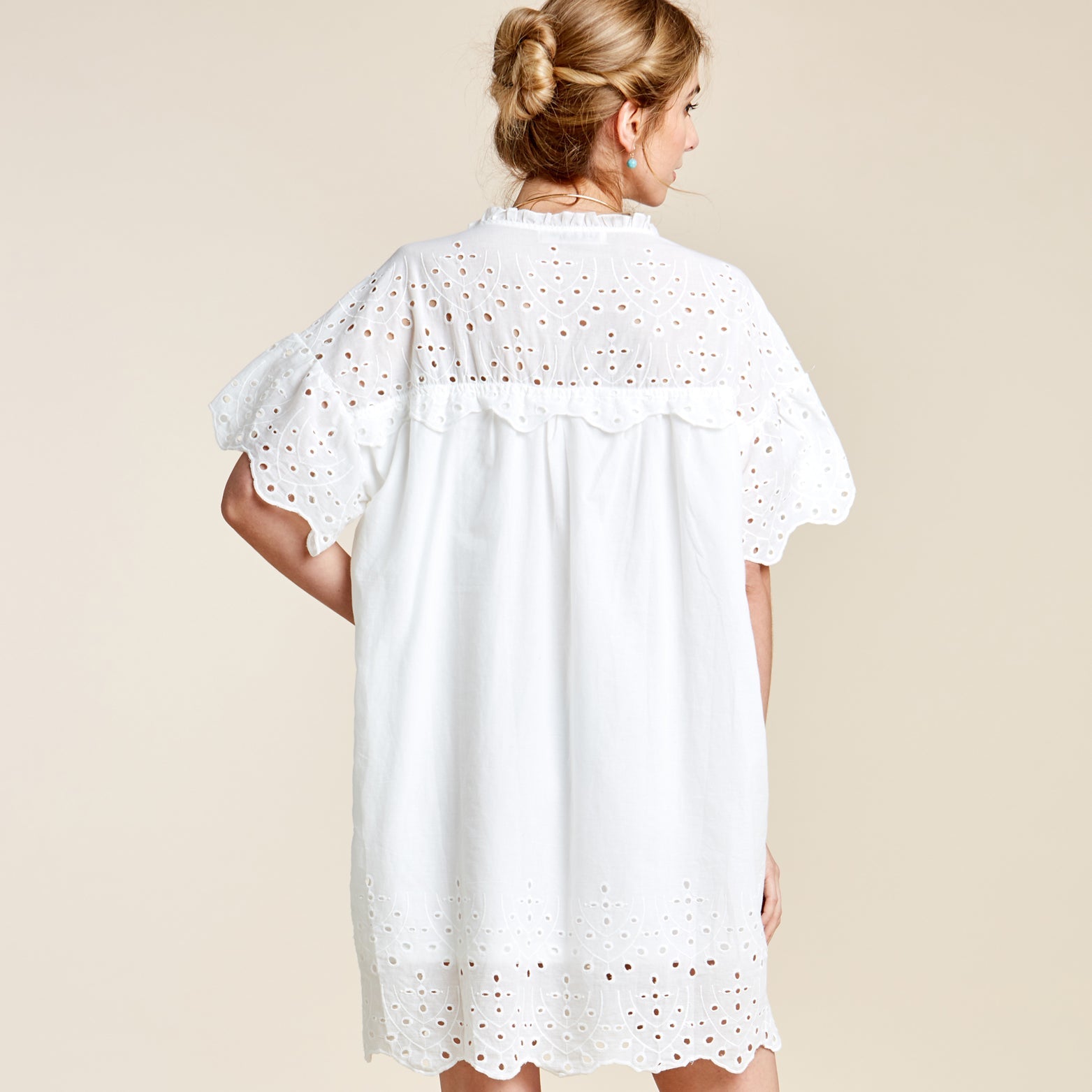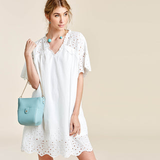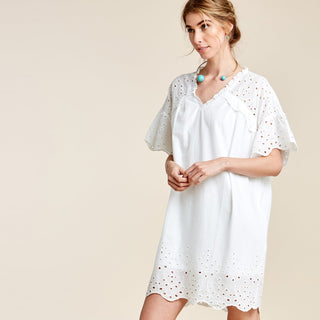 Its getting warmer and you just want to wear something cute and light...Well we got you covered! Our Eyelet Bell Sleeve Pocket Dress is soft, lightweight, and it has an oversized fit so you feel just right in it!