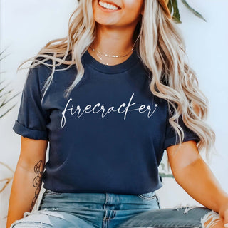 Hey, you stylish firecracker! Looking to make a statement with your fashion? Our "Firecracker" Graphic Tee is just the thing you need to add that pop of patriotic spirit to your wardrobe. With its chic white script declaring "Firecracker," this tee perfectly reflects your lively personality and love for celebration.