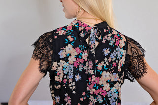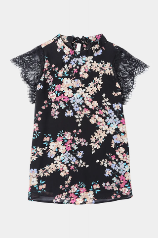 The women's blouse showcases a subtle floral print, introducing an element of grace and refinement. Intricately designed lace sleeves contribute a beautiful and detailed aspect, enhancing the overall appearance. Whether paired with jeans and sneakers for a relaxed daytime ensemble or matched with a skirt and heels for a more formal affair, this Dainty Floral Print Lace Sleeve Blouse with a tie-back exudes style and femininity, making it an ideal choice for various occasions.