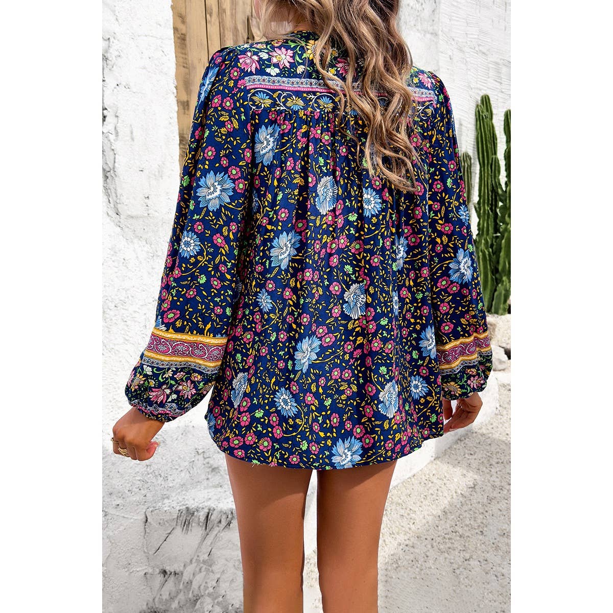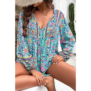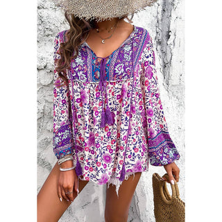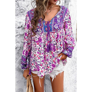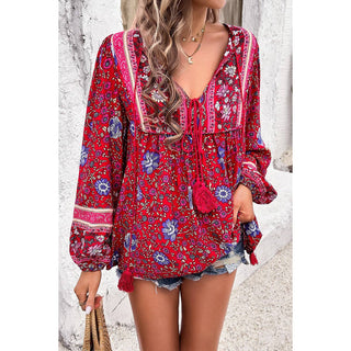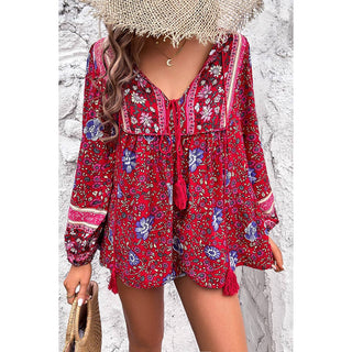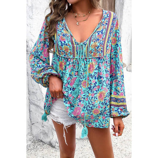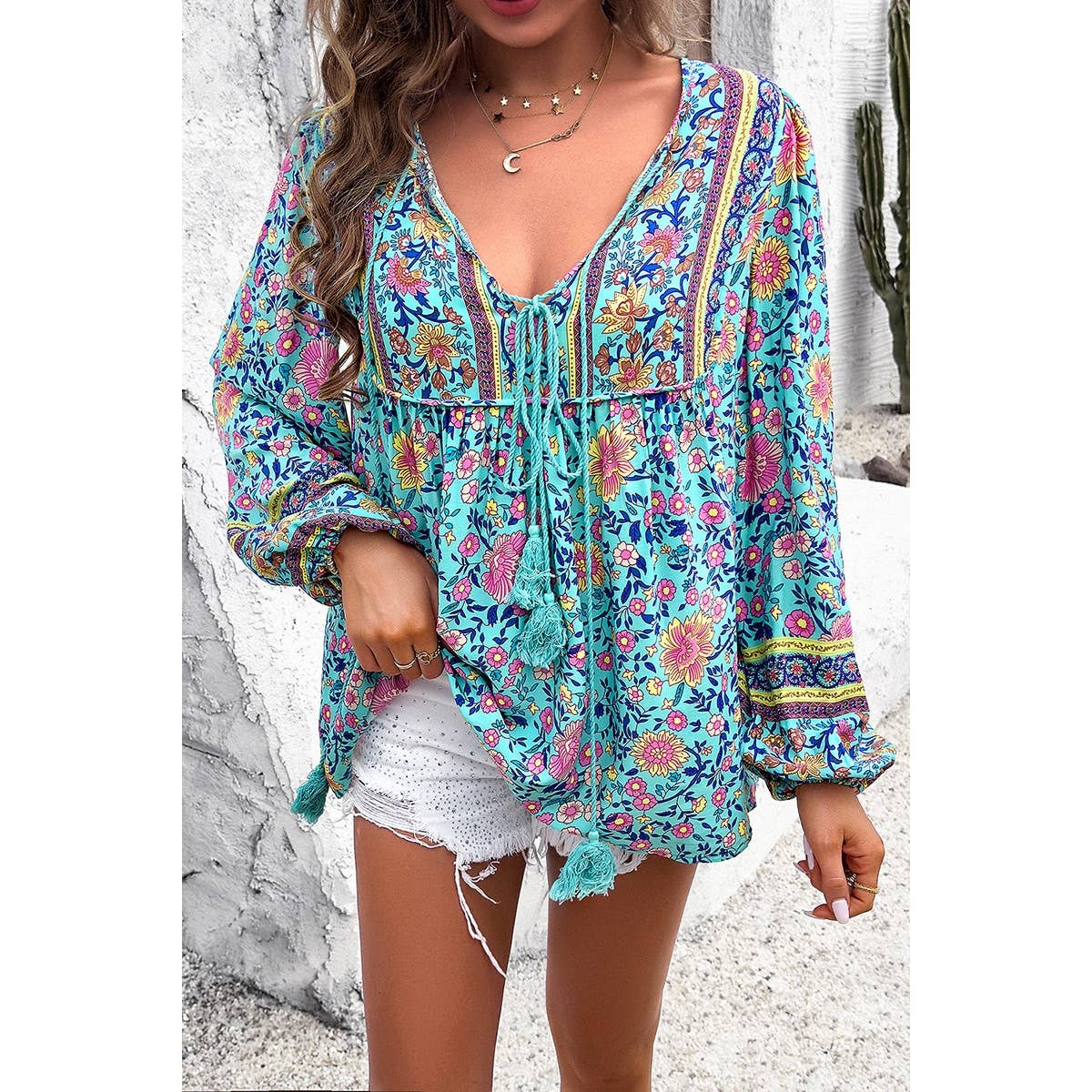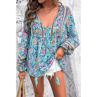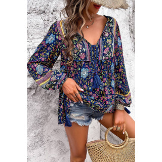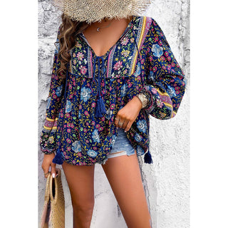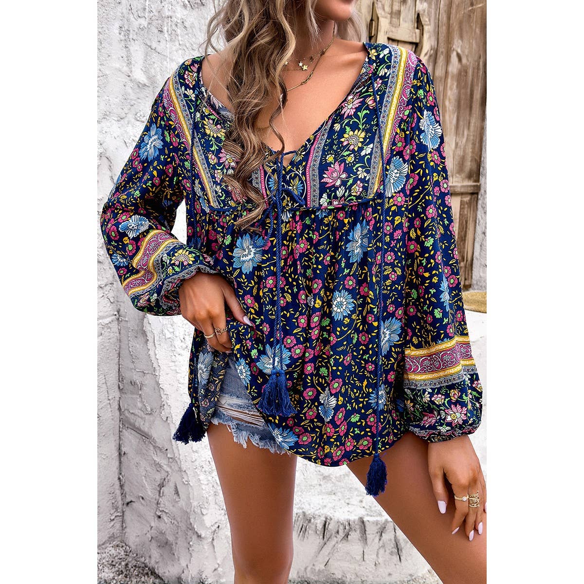A charming V-neck top with tie tassels, long sleeves with elastic cuffs, and a relaxed fit. The hip-length cut and allover boho floral woven fabric make it perfect for any casual outing.