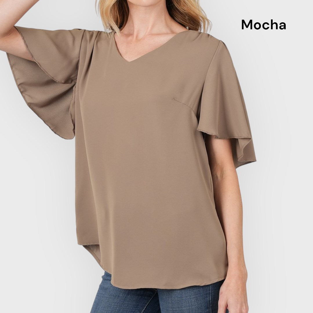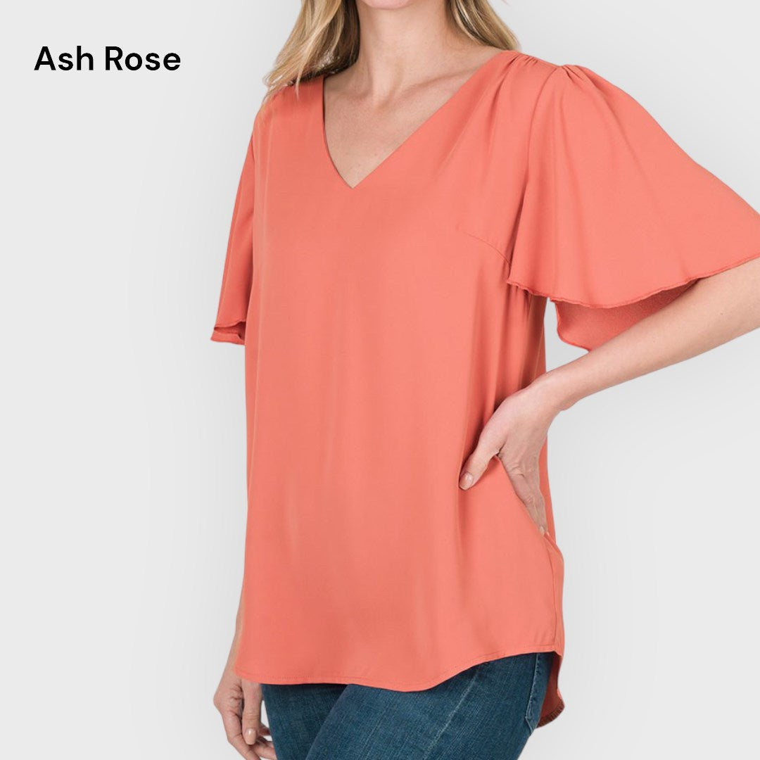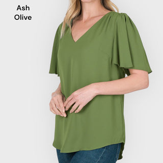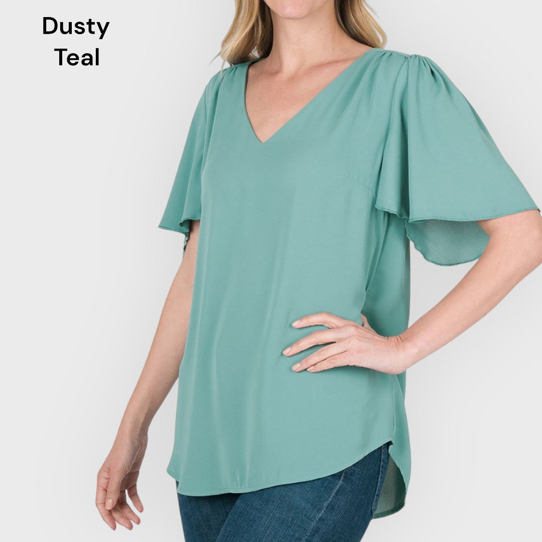 Keep it casual in this everyday waterfall Flutter Sleeve V-Neck Top featuring a v-neckline and rounded hem.