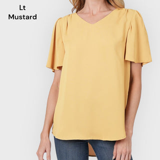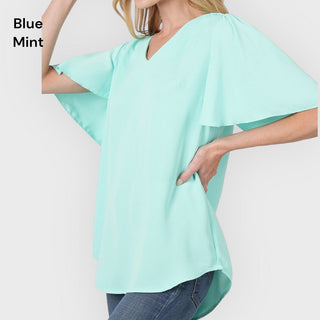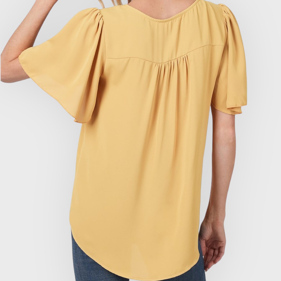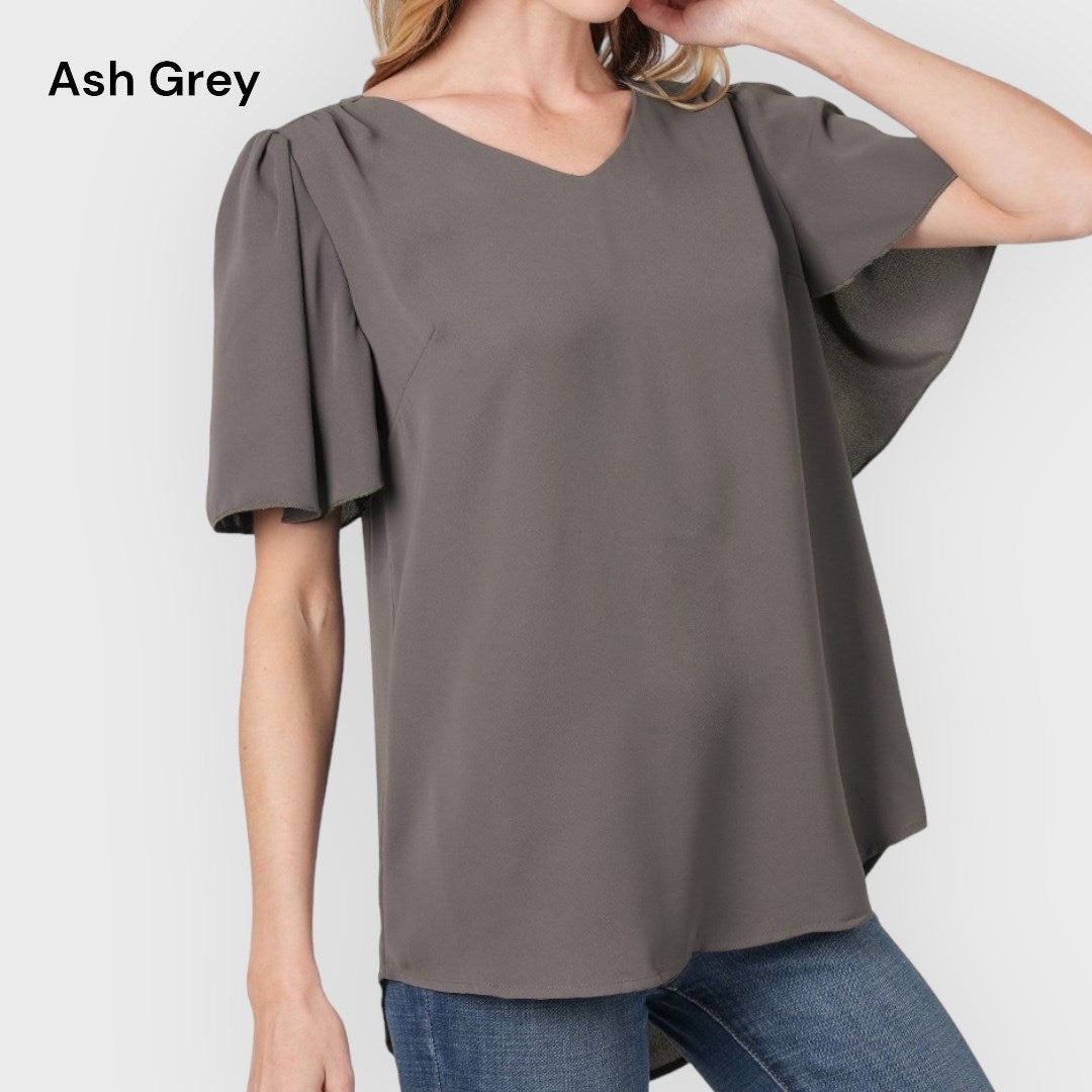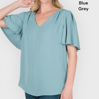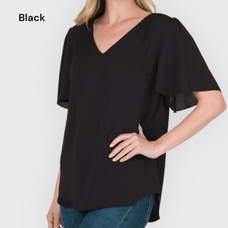 Keep it casual in this everyday waterfall Flutter Sleeve V-Neck Top featuring a v-neckline and rounded hem.
