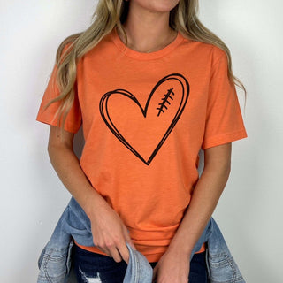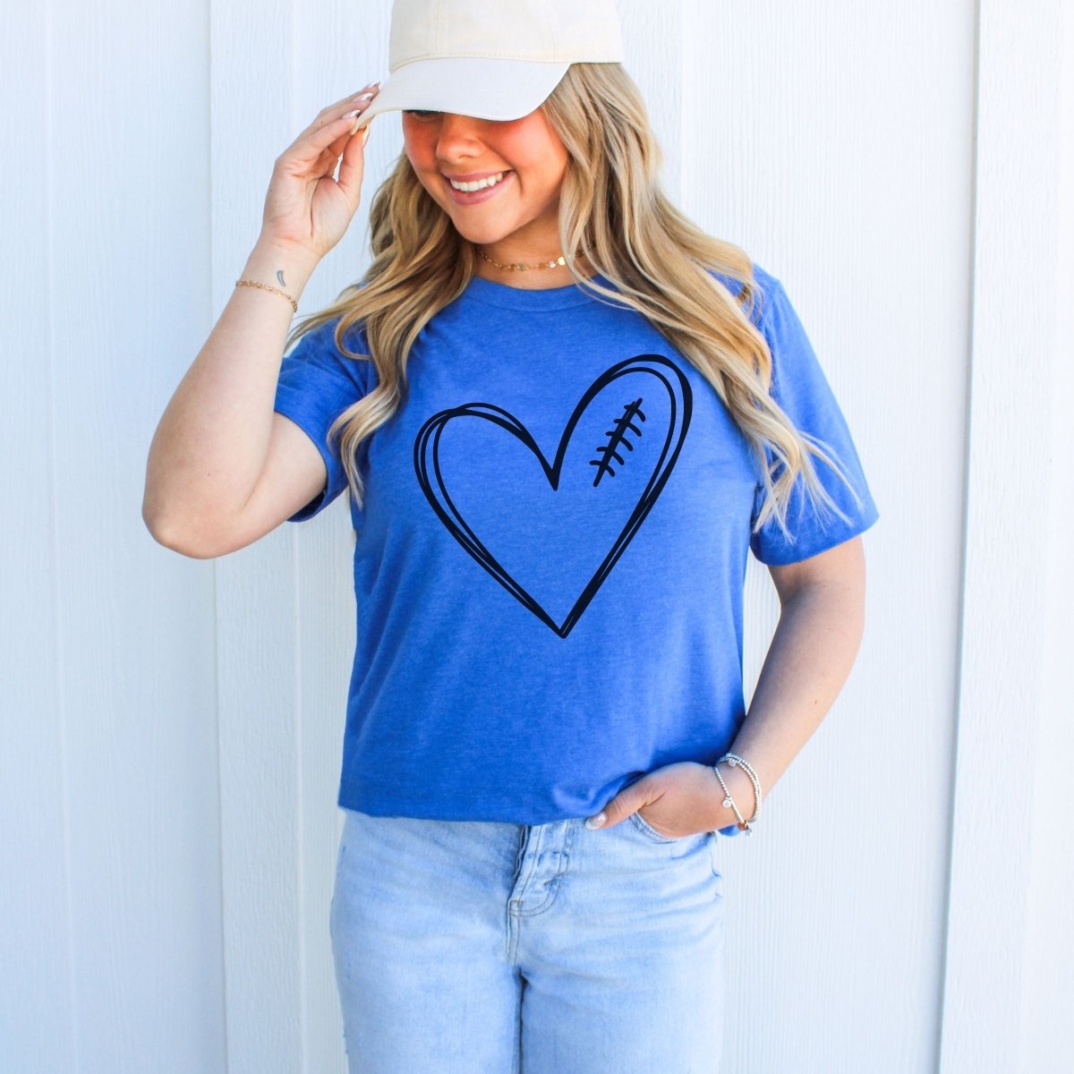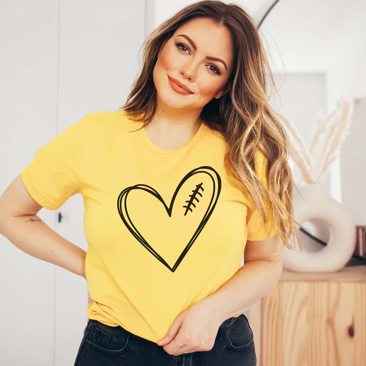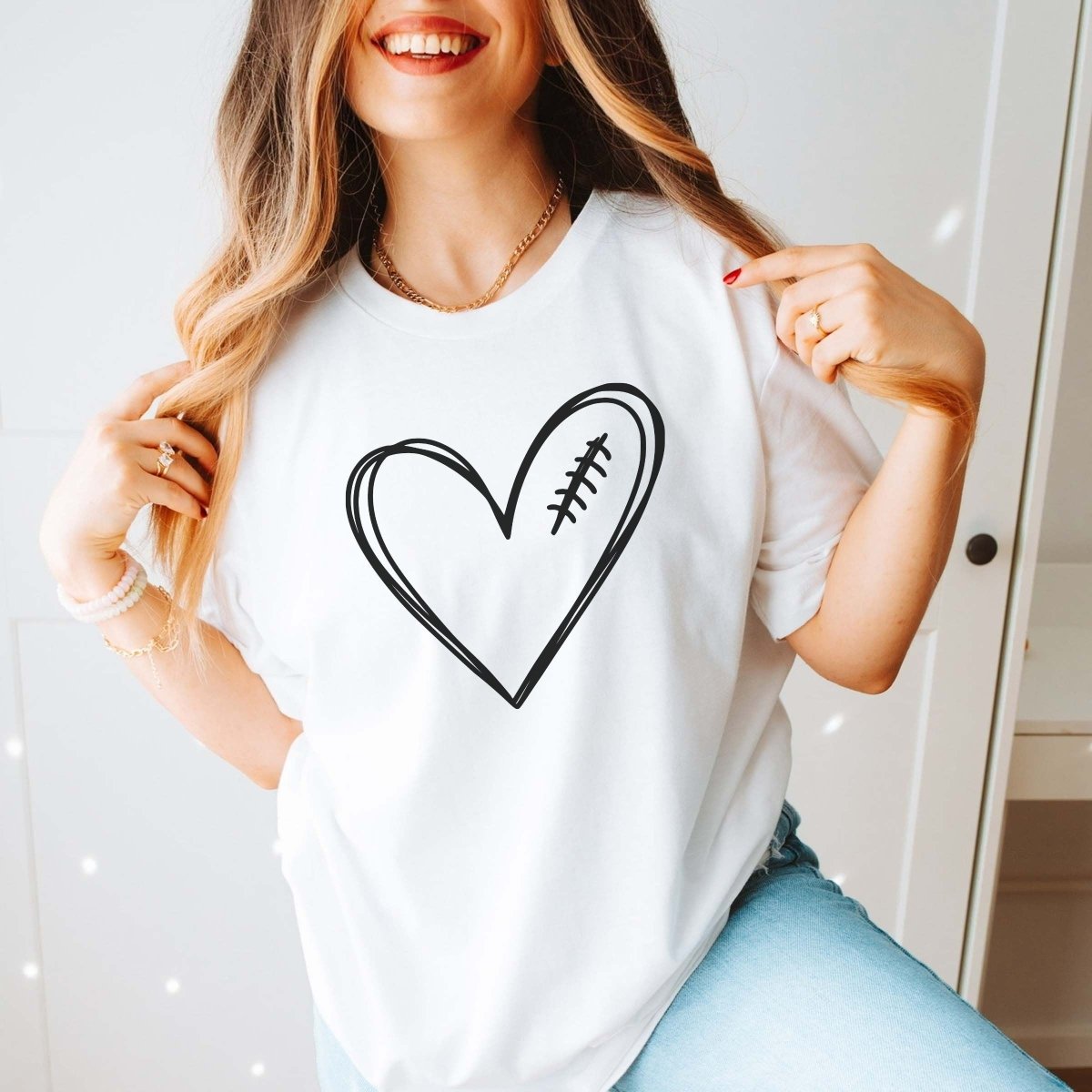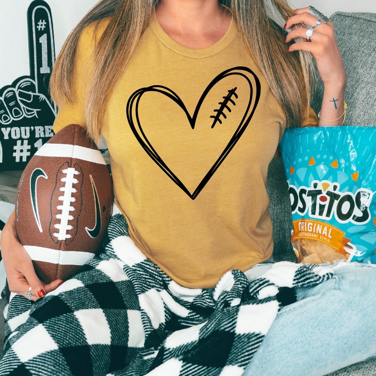 Hey, football enthusiast! Ready to express your passion for the game in a trendy way? Our Football Heart Graphic Tee is just what you need to kick off the season with charm and energy. Whether you're cheering from the bleachers, throwing a tailgate bash, or enjoying the game at home, this tee blends sporty vibes with cozy ease.