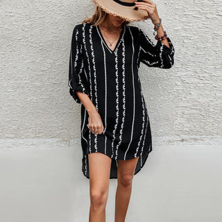 Introducing our Geo Striped Tab Sleeve Tunic Dress! Elevate your style with this chic piece featuring a V-neck, tab sleeves, and a waist tie for a flattering fit. With a hi-lo round hem and crafted from geo vertical stripes woven fabric, this dress offers a stylish twist on the classic tunic silhouette. Perfect for a casual yet sophisticated look.