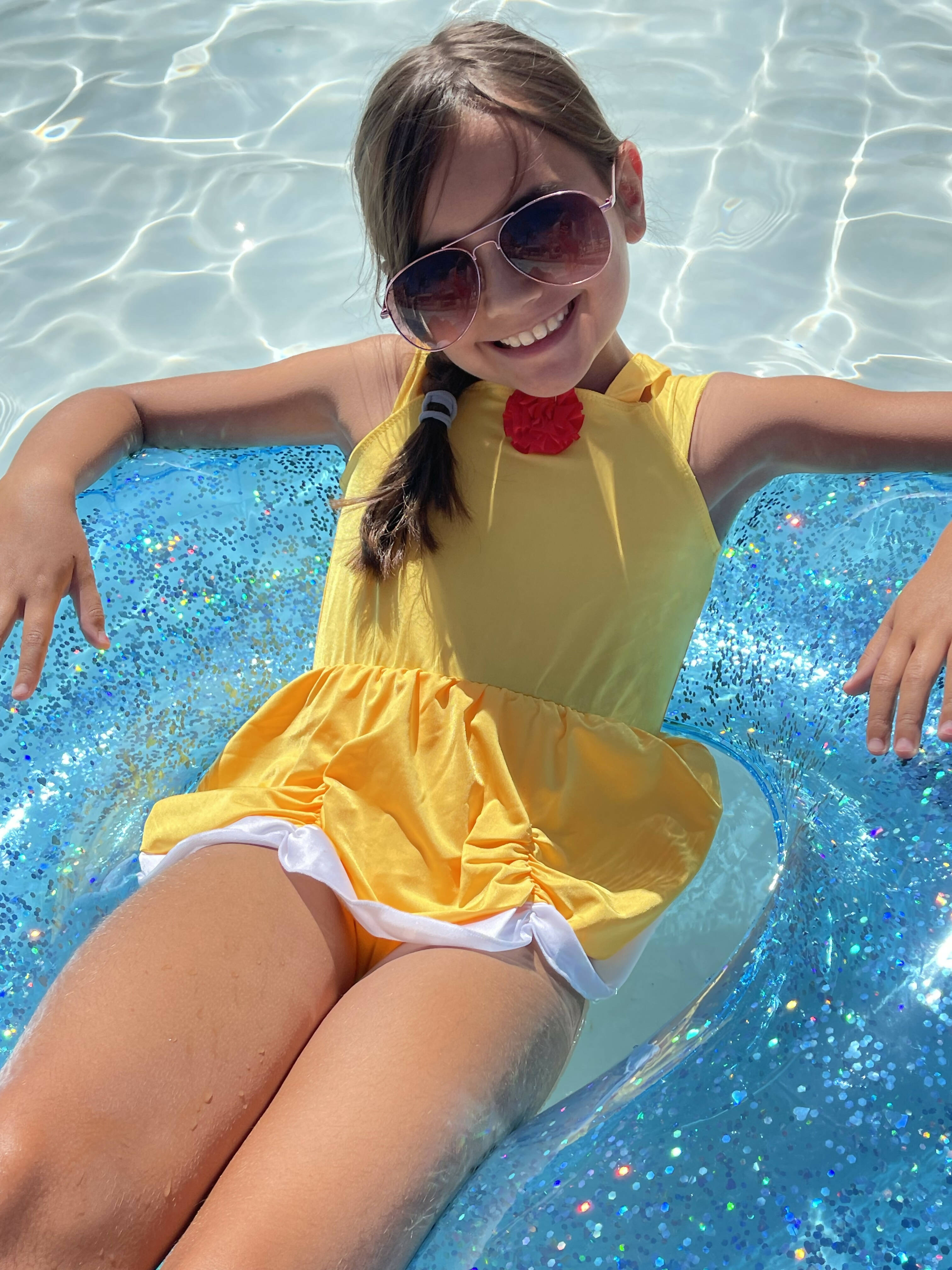 This colorful character-inspired swimsuit is perfect for a day of fun in the sun. Enjoy at the beach or pool. It not only adds a playful touch to her swimwear, but its durability ensures she can enjoy countless hours of splashing and swimming.