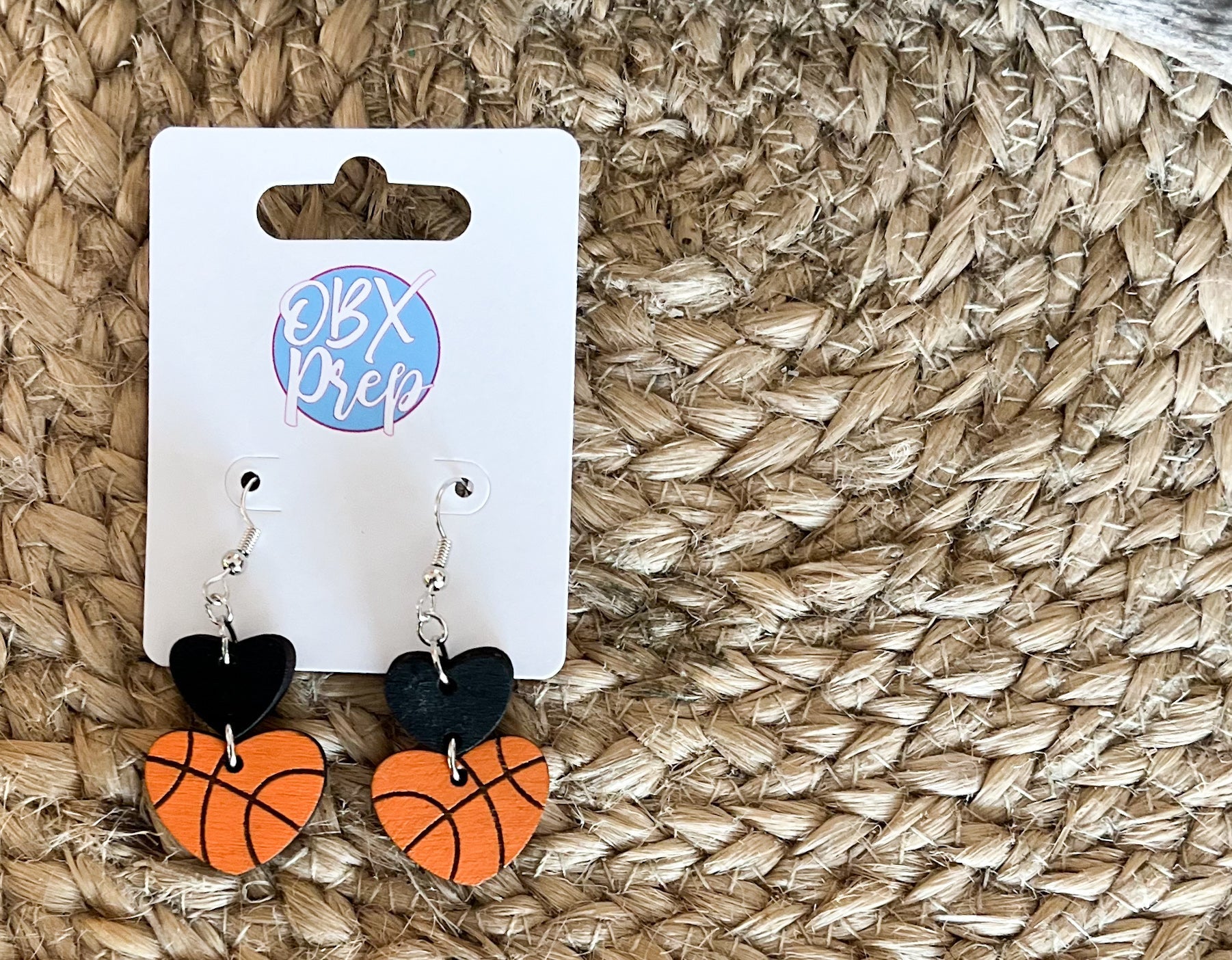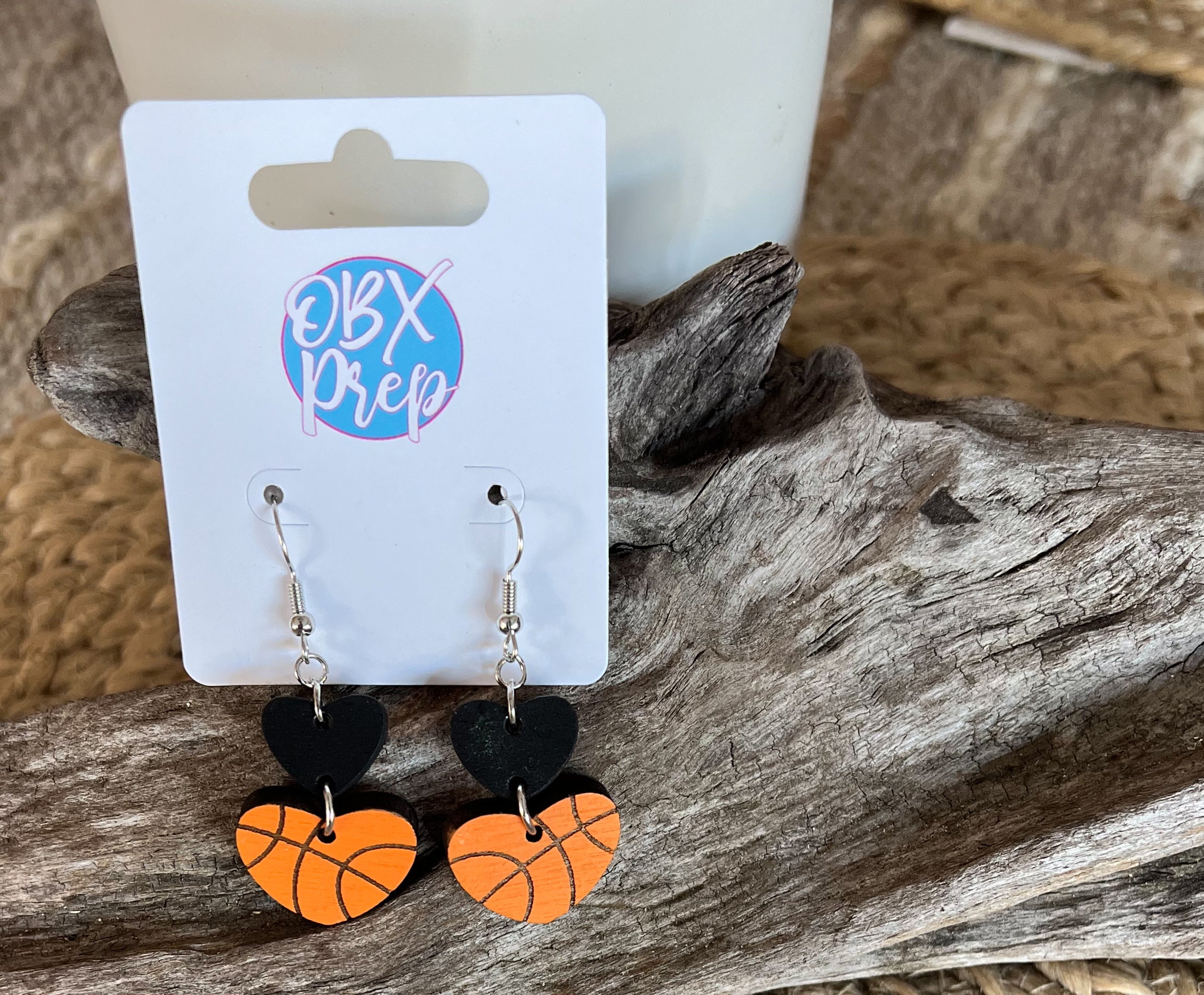 Hand-Painted Wood Heart Basketball Earrings with Customizable Top Heart